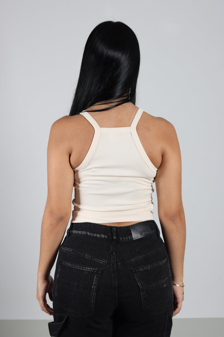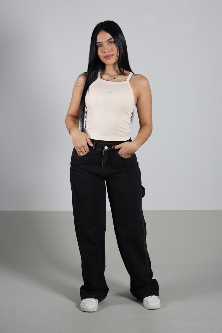La modelo mide 1,60 m y usa talla S en la parte superior y 06 en la parte inferior.
