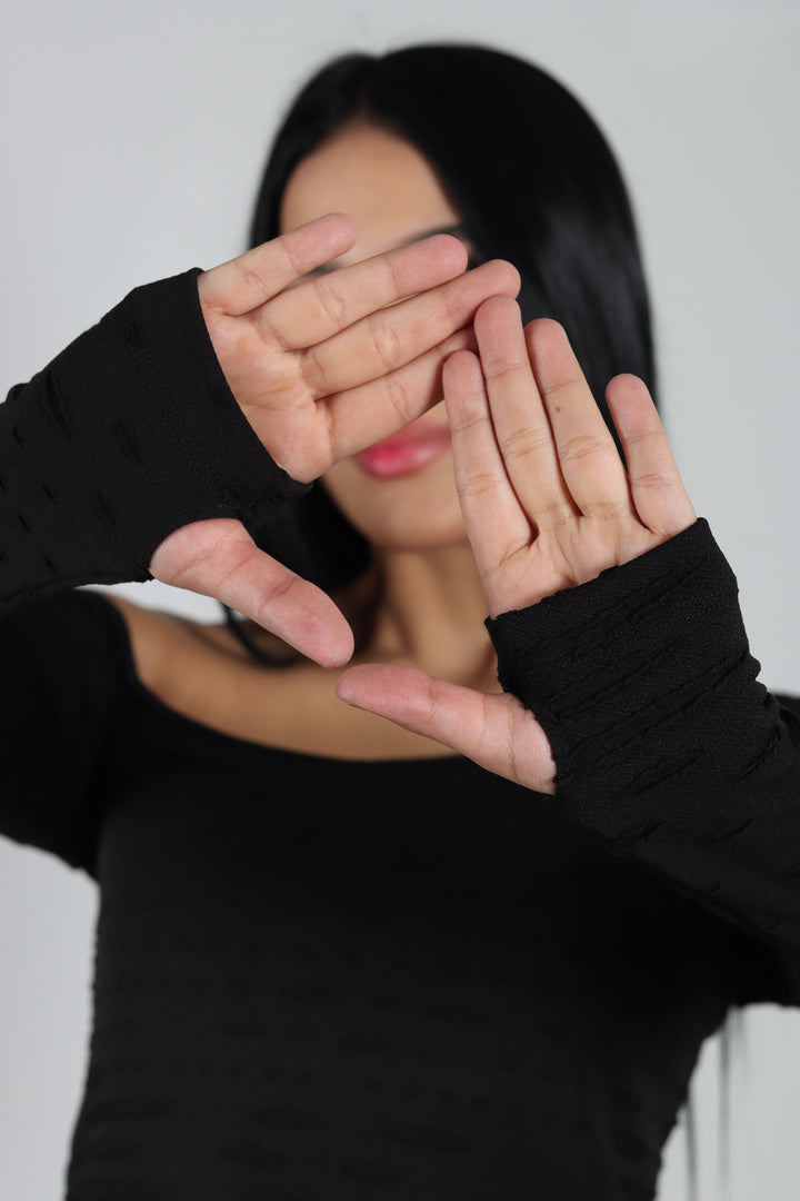 Blusa Negra de Manga Larga, con un diseño asimétrico donde una curva recorre desde el hombro hasta el brazo, dejando el otro lado descubierto. La tela lleva una textura de cortes sobre fondo negro que le da relieve y un acabado moderno. Silueta ajustada y limpia.