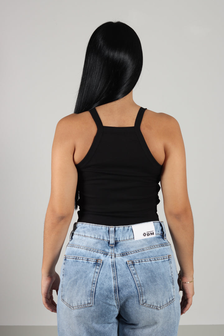 Blusa Negro de Escote Recto y Tiras, con una silueta ajustada y limpia. Lleva el logo estampado en semialta sobre el pecho, manteniendo un detalle sutil sin perder el estilo minimal.