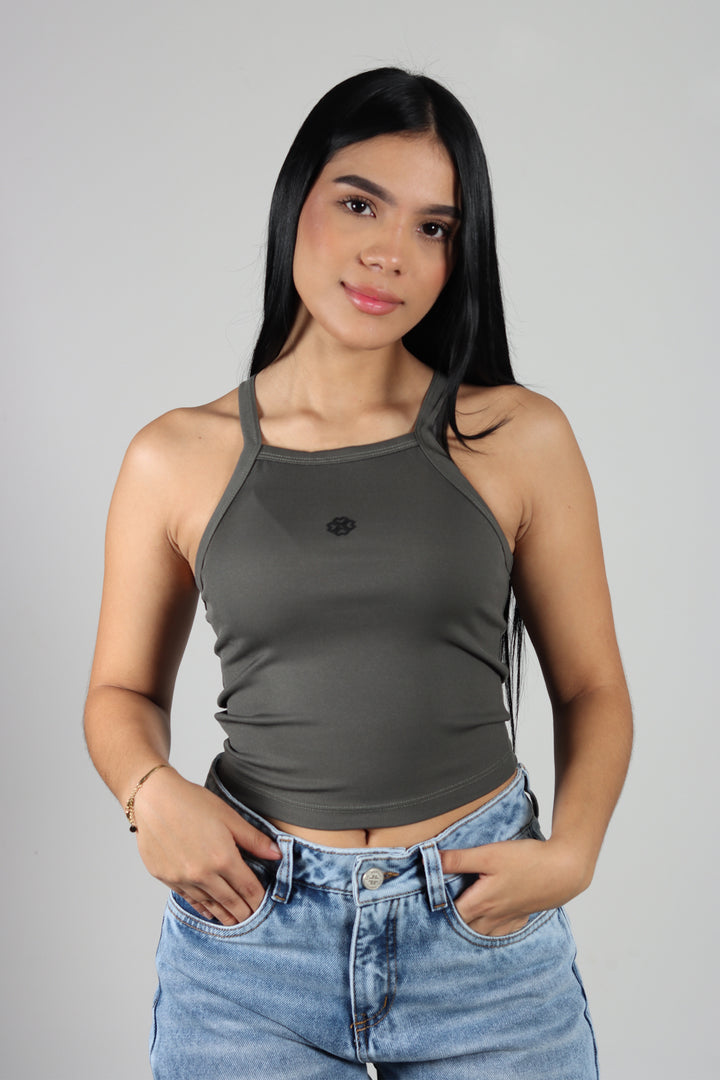 Blusa Verde Militar de Escote Recto y Tiras, con una silueta ajustada y limpia. Lleva el logo estampado en semialta sobre el pecho, manteniendo un detalle sutil sin perder el estilo minimal.
