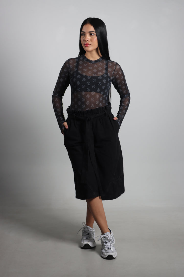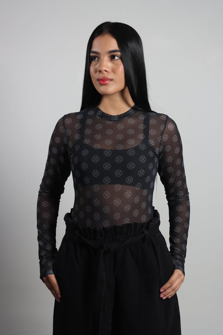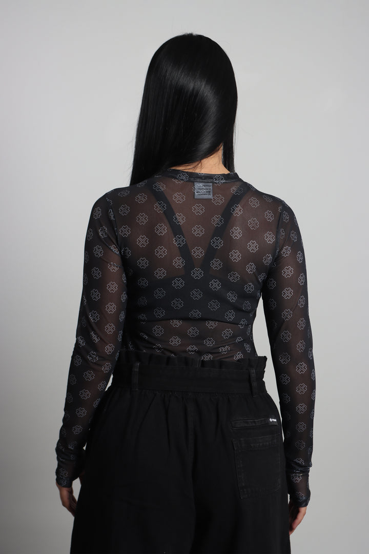 Body de manga larga en tono negro, silueta ajustada y escote redondo. La tela lleva el isotipo de la marca sublimado en toda la superficie, creando un diseño distintivo y uniforme.