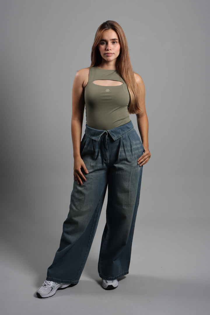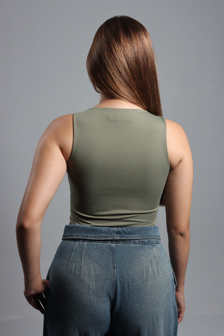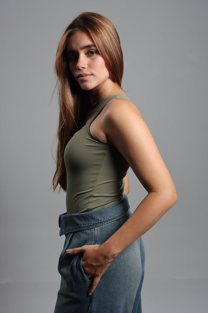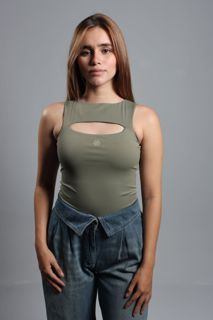 Body de silueta slim en verde oliva. Abertura en el escote y estampado en semialta del logo en el pecho. Ajustado al cuerpo, suave y perfecto para destacar.