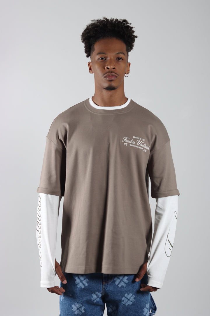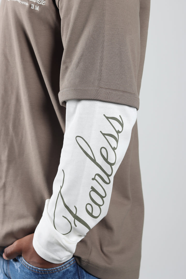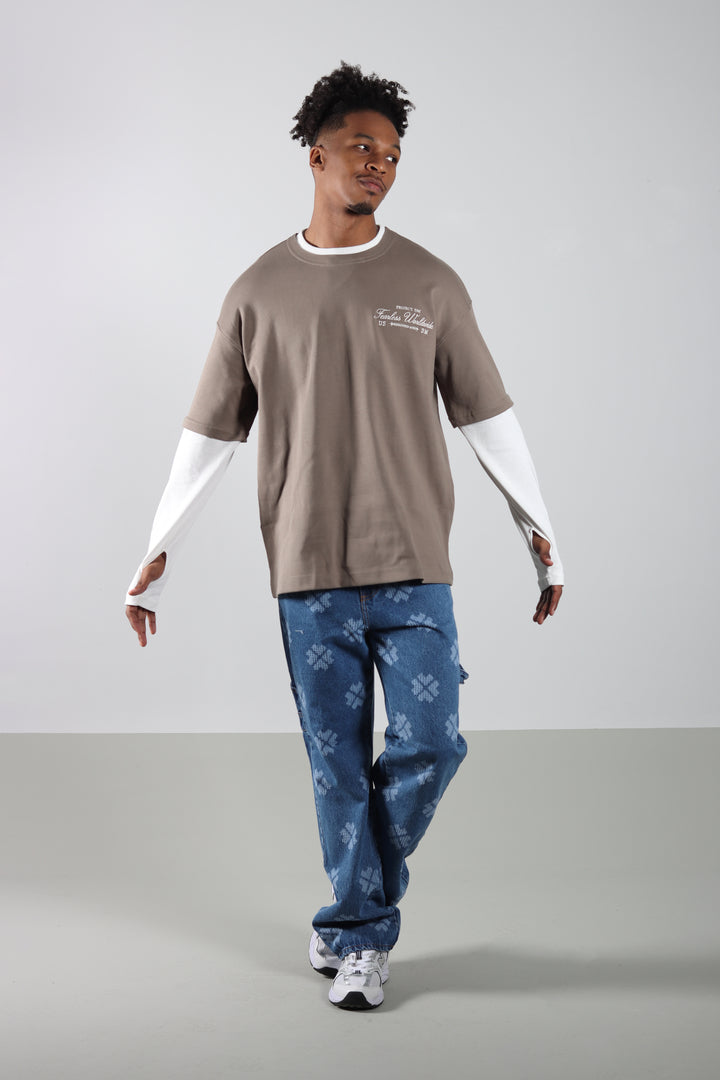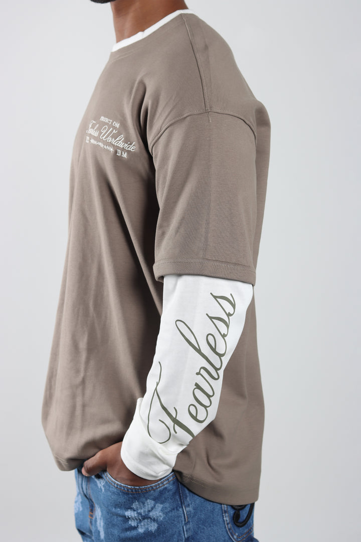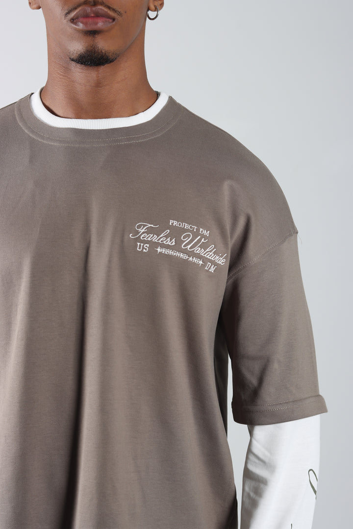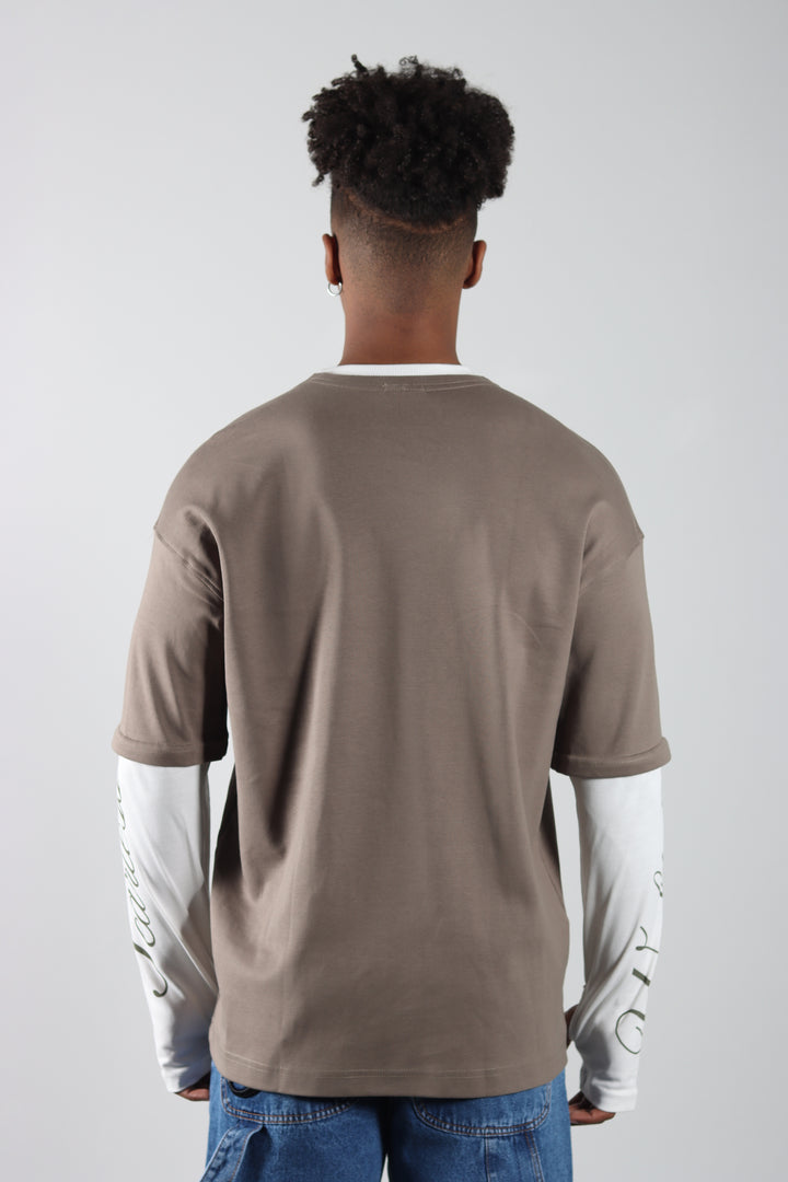 Buso Gris Verdoso Doble Manga Oversize, con mangas blancas que llevan un estampado en gris verdoso para contraste. En el pecho incluye un bordado sutil que completa el diseño. Silueta amplia y cómoda.