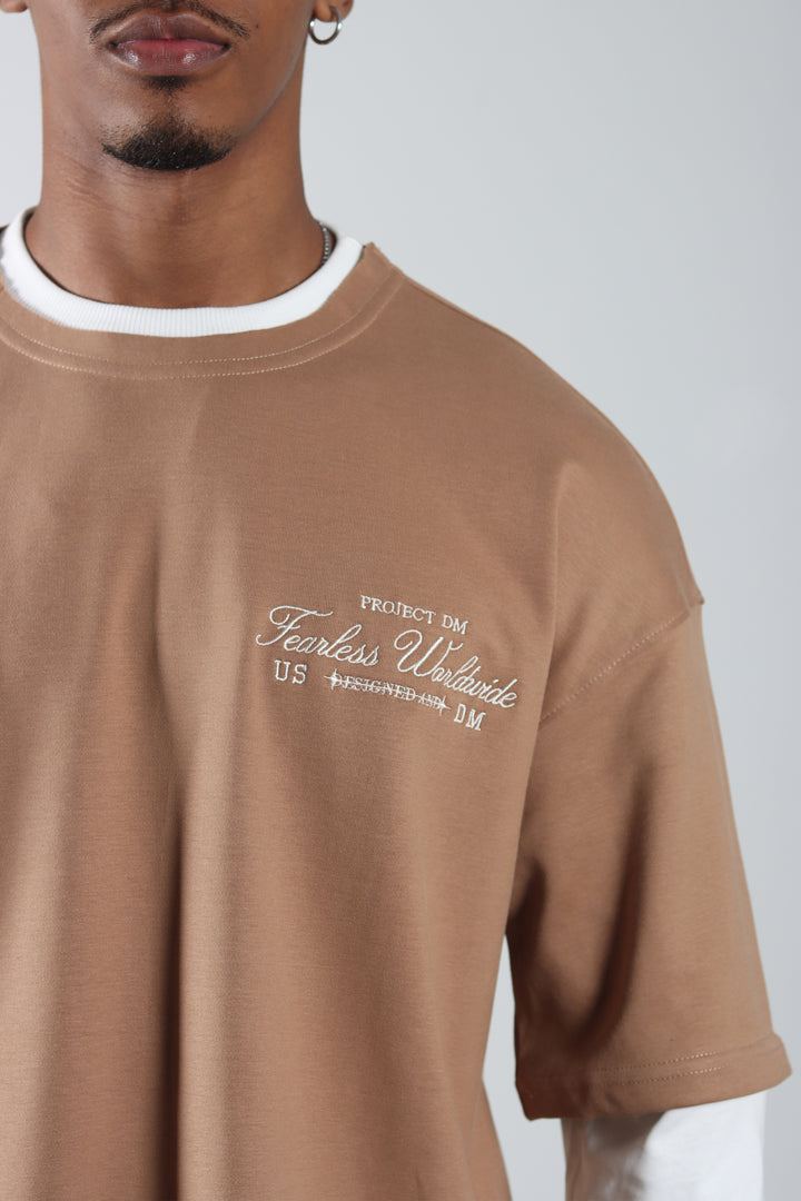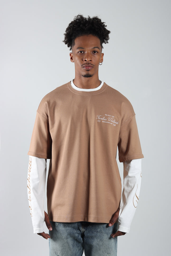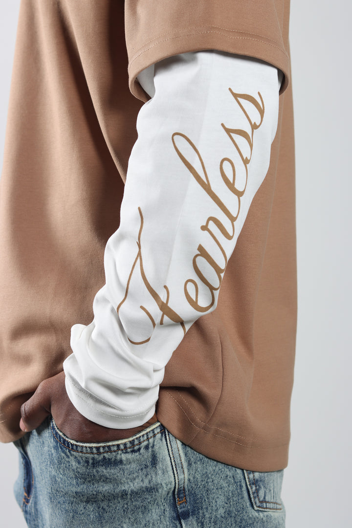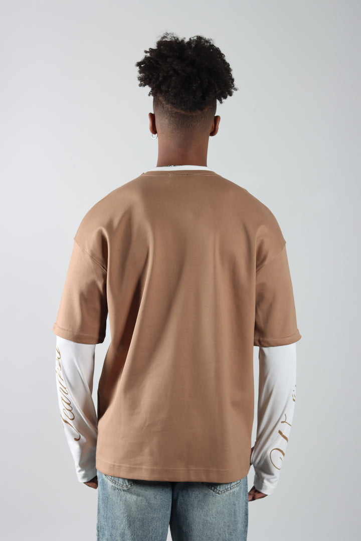 Buso Taupe Doble Manga Oversize, con mangas blancas que llevan un estampado en taupe para contraste. En el pecho incluye un bordado sutil que completa el diseño. Silueta amplia y cómoda.