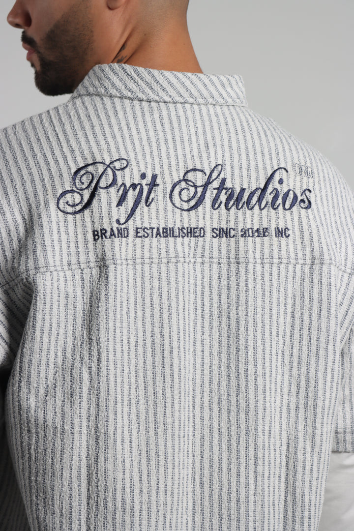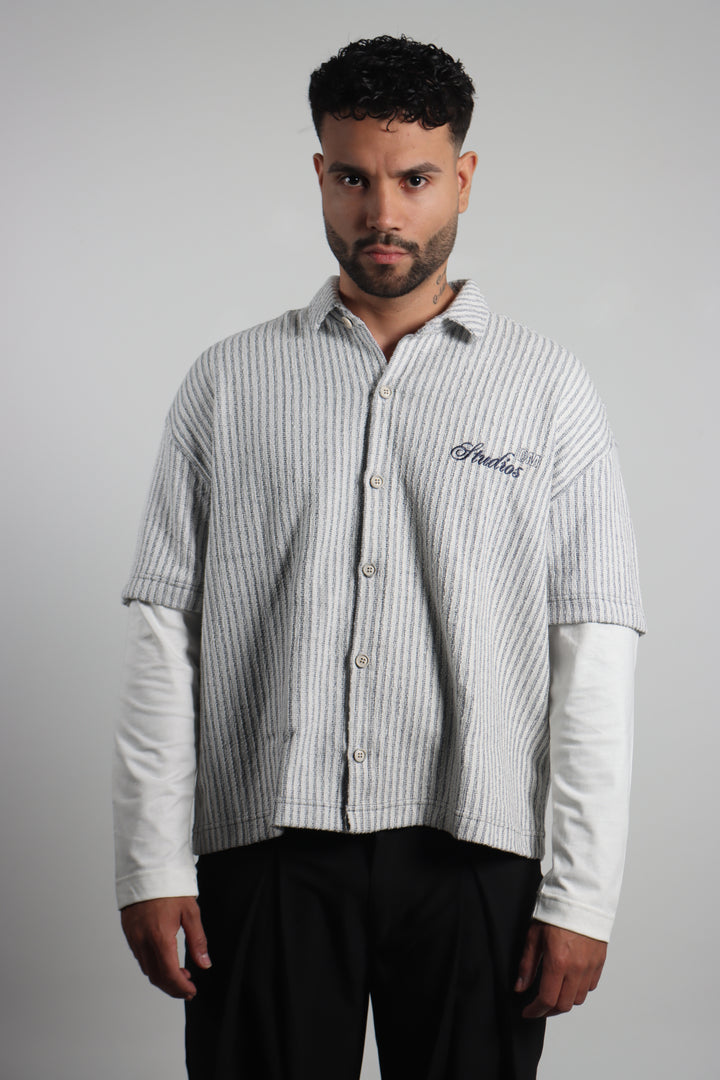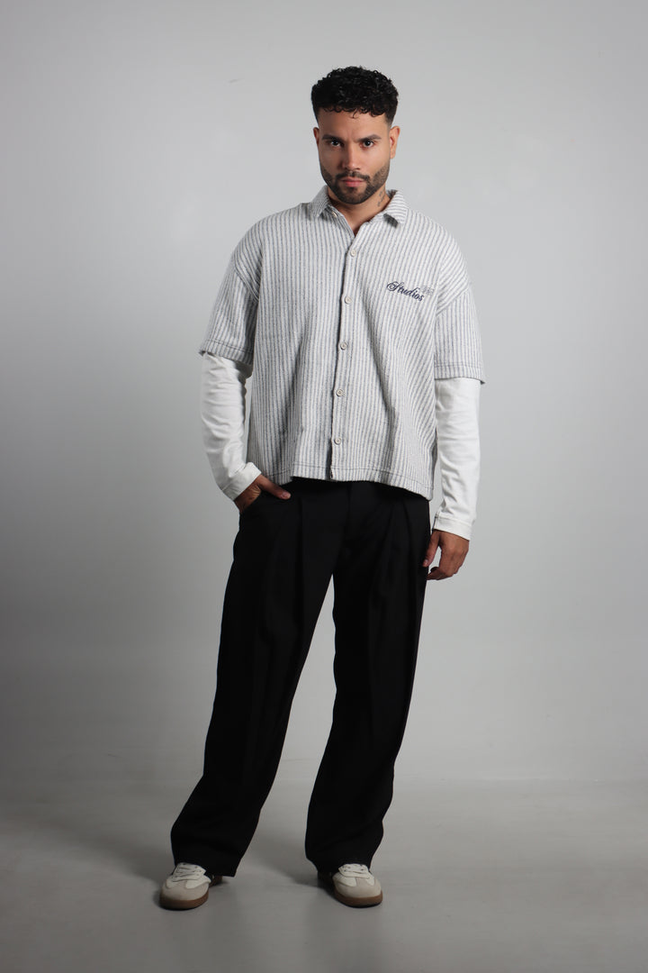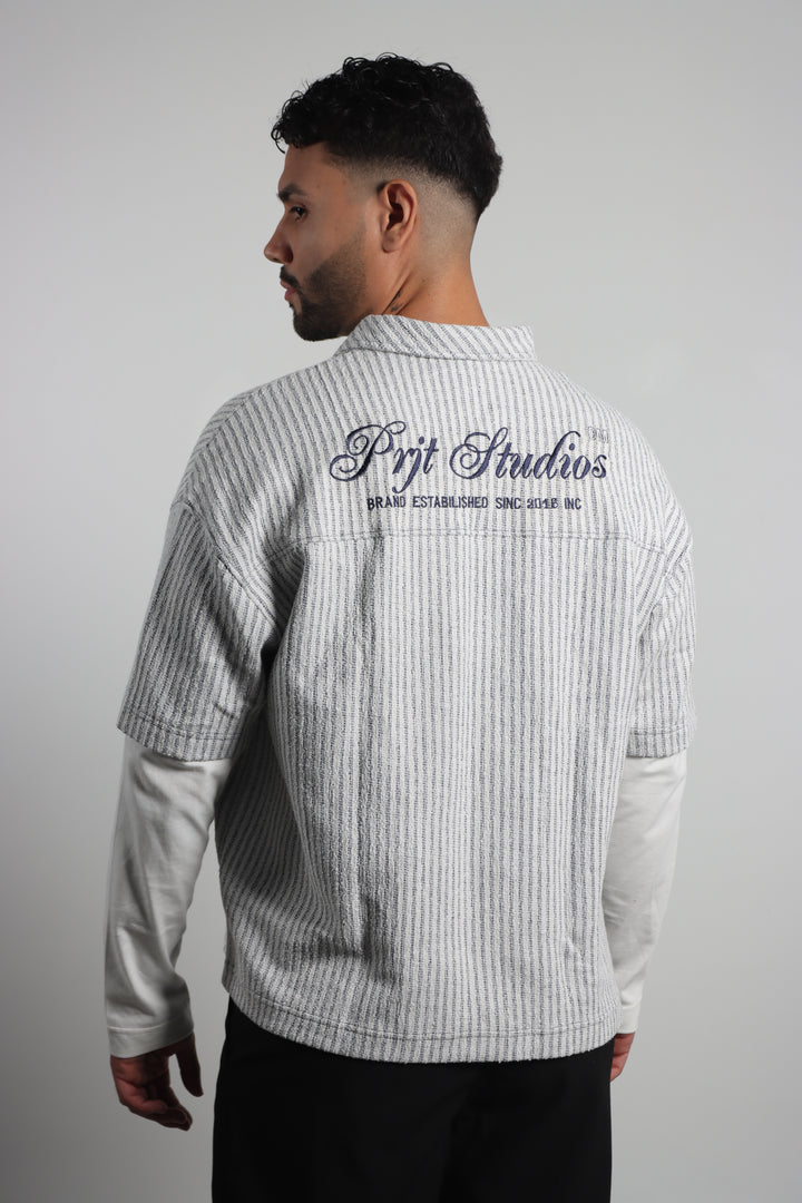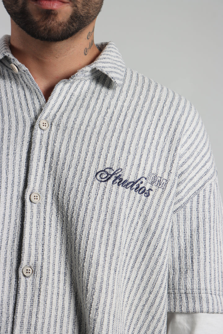 Camisa en color marfil con rayas, silueta boxy fit. Presenta manga larga con doble acabado y bordados en frente y espalda que le aportan carácter y un detalle distintivo.