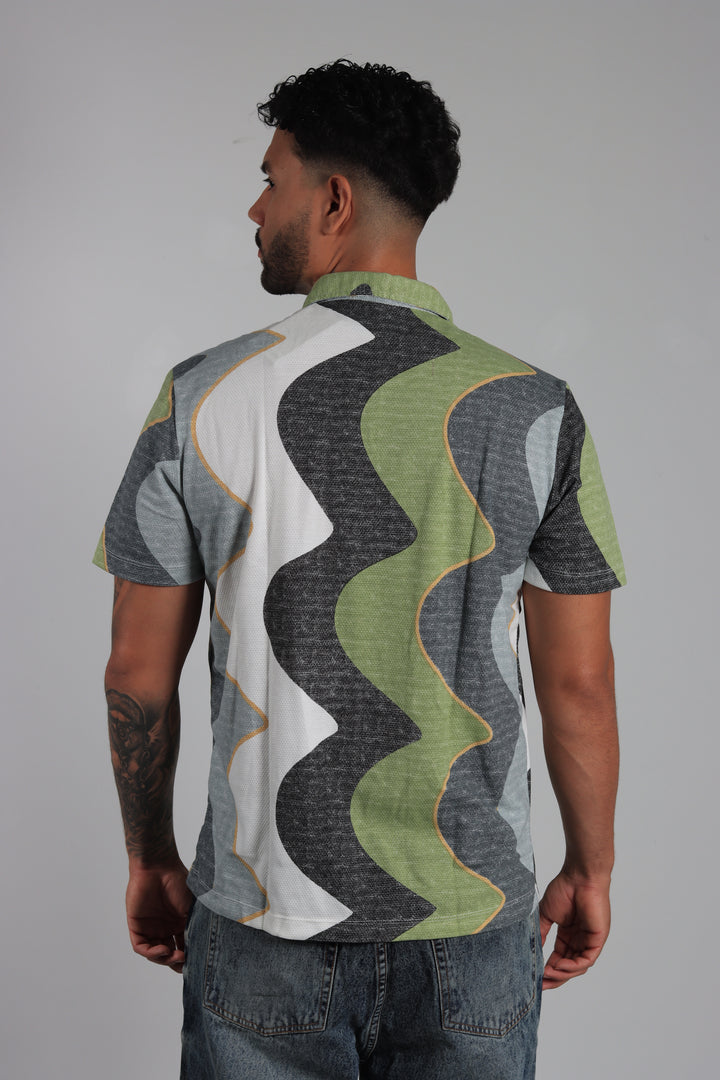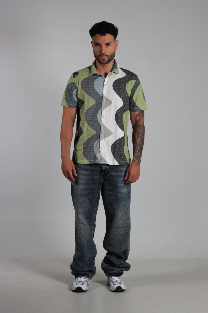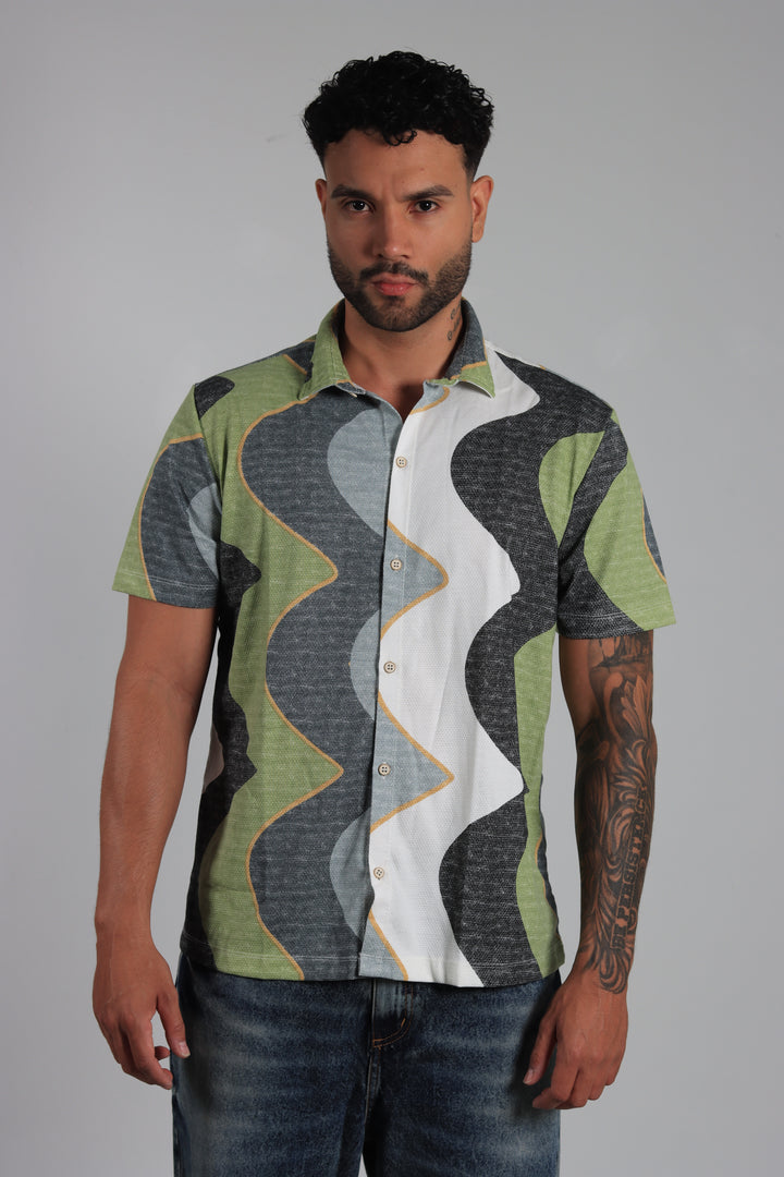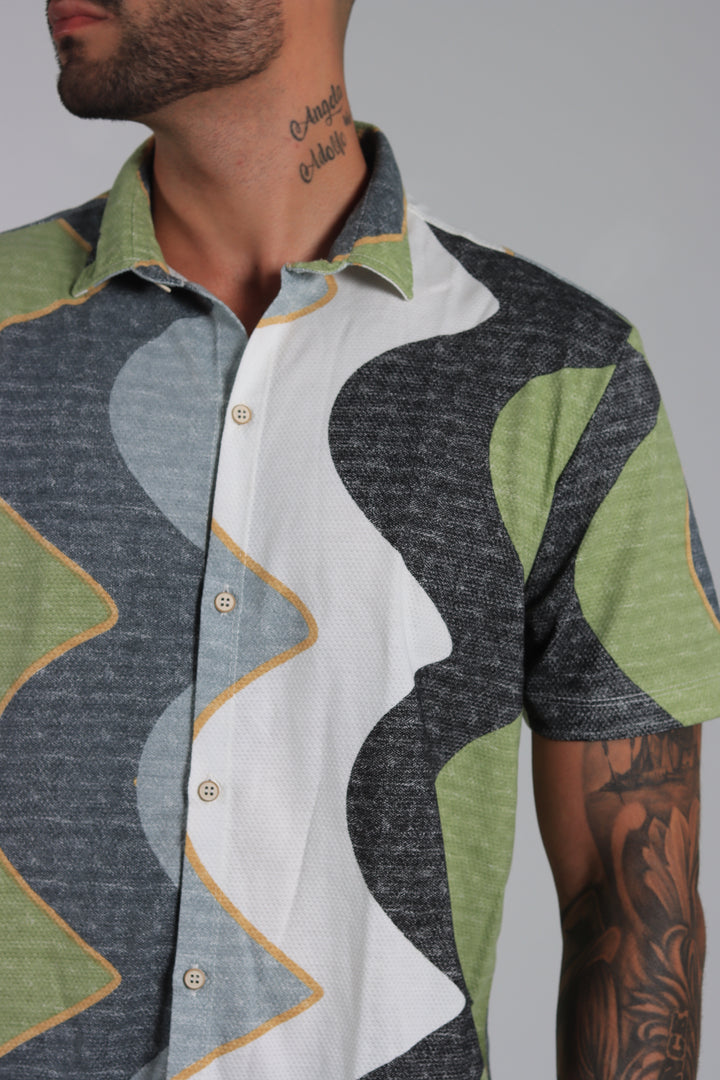 Camisa de silueta regular en tono marfil con textura ligera. Cuello Luigi con curvas en contraste verde, marfil y gris. Detalle distintivo en un diseño clásico y fresco.