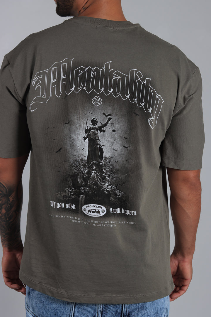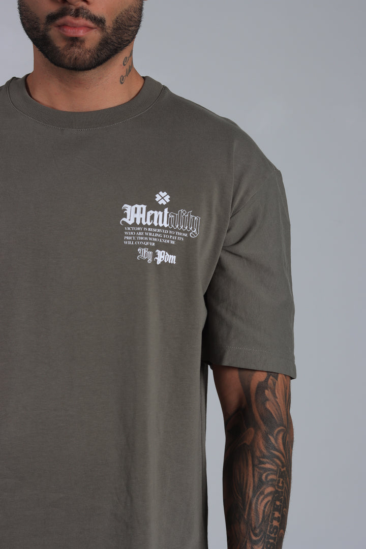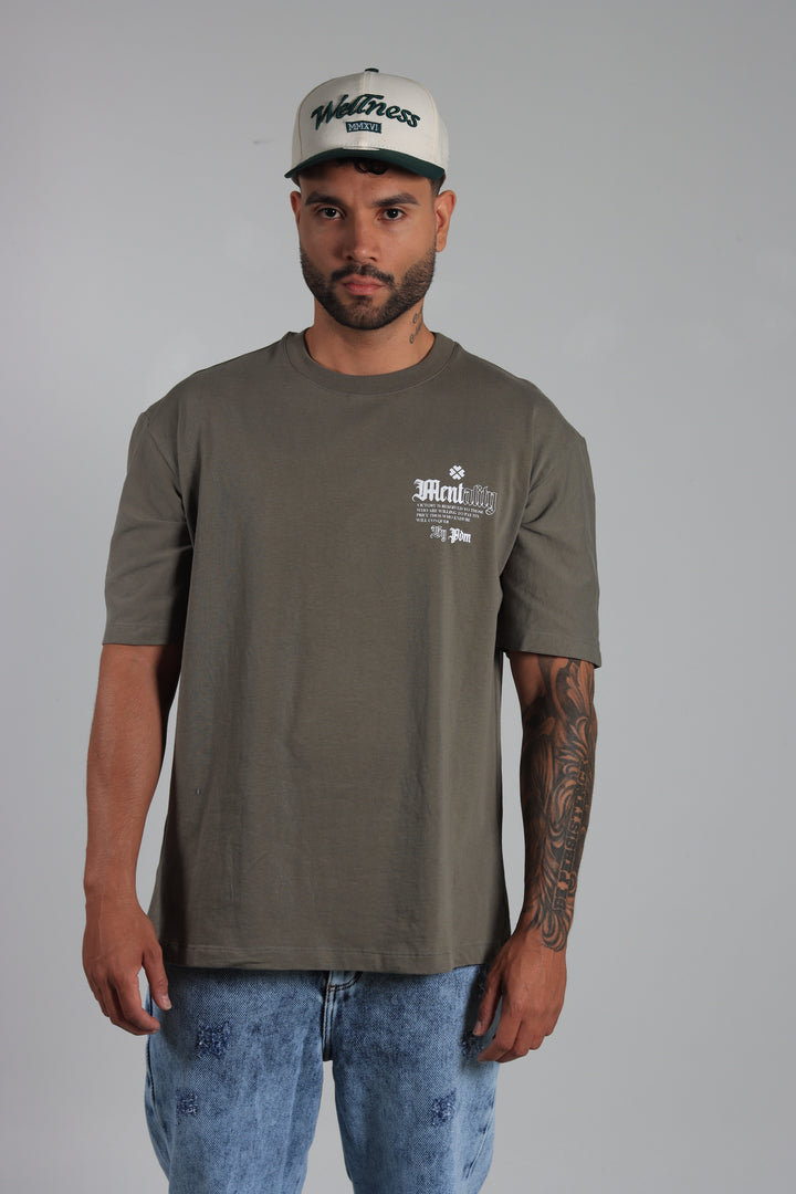Camiseta de silueta oversize en color gris verdoso. Tela pesada que aporta estructura. Estampados gráficos al frente y en la espalda. Suelta, cómoda y con actitud para el día a día.