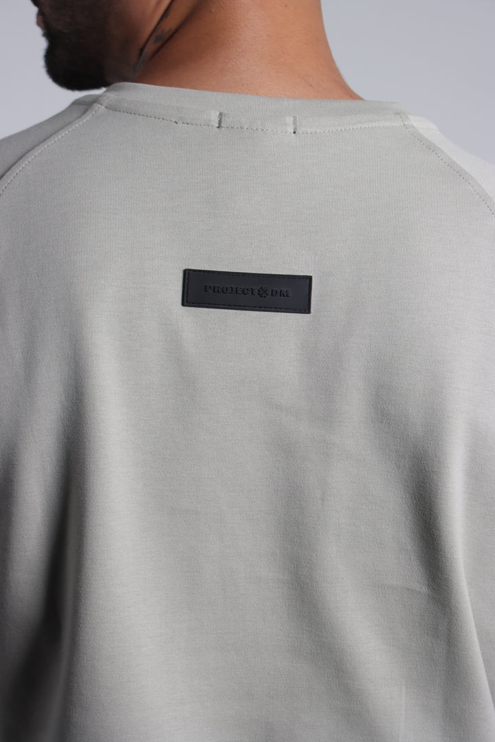 Camiseta de silueta regular con mangas rangla, aplique negro de la marca en la espalda y corte en contraste color marfil.