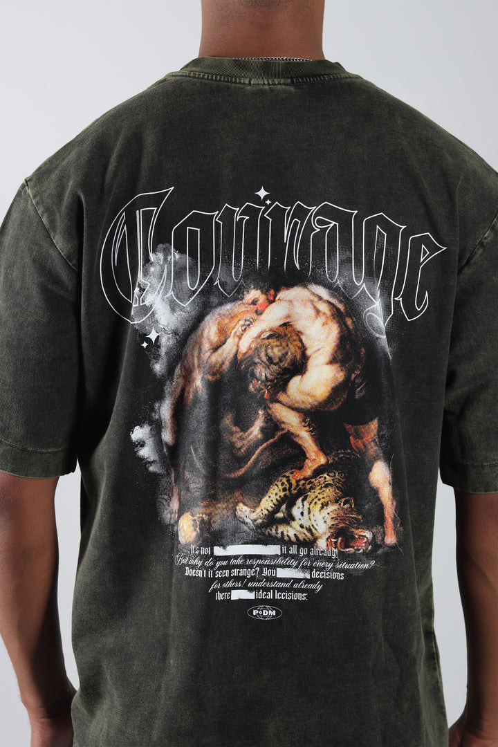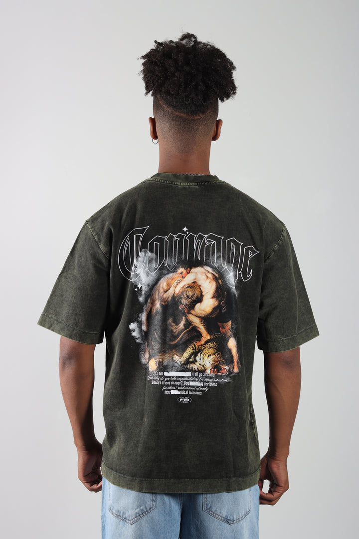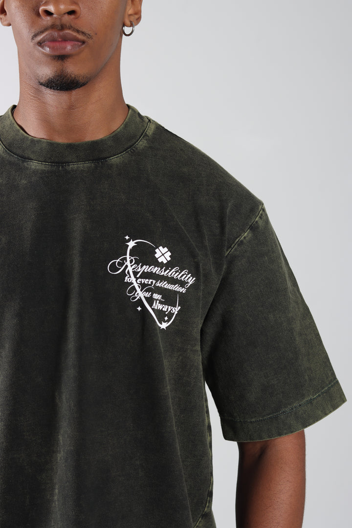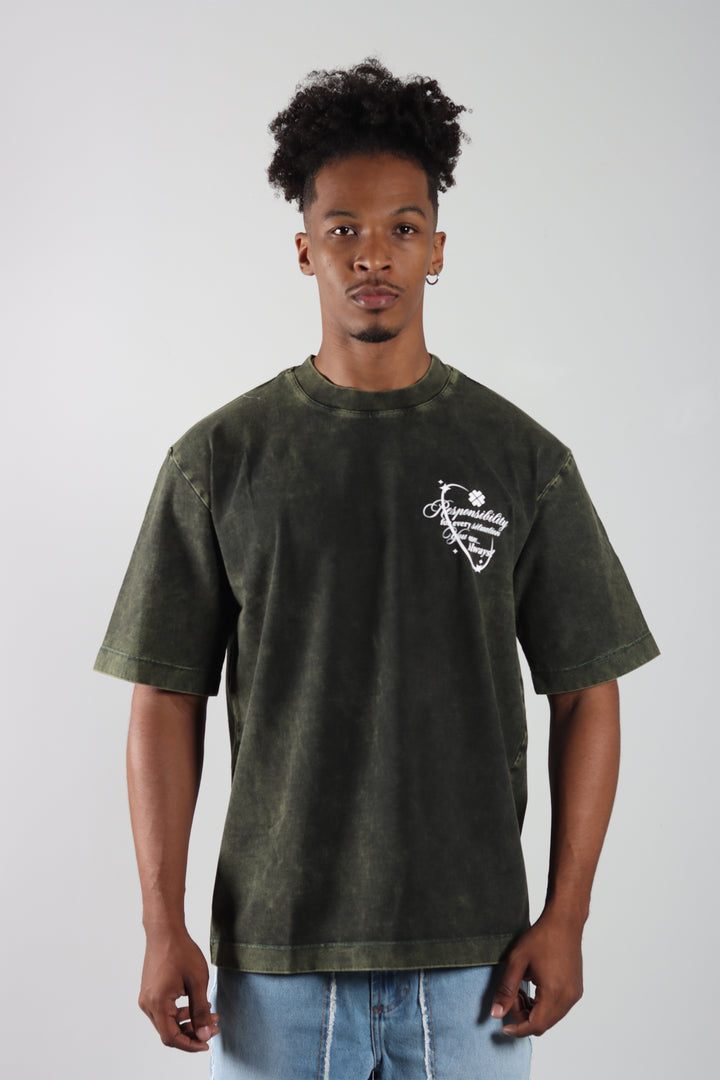 Camiseta Verde Oversize Acid Wash, con un acabado desgastado y estampado en el frente y la espalda. Silueta amplia y cómoda, de estilo relajado.