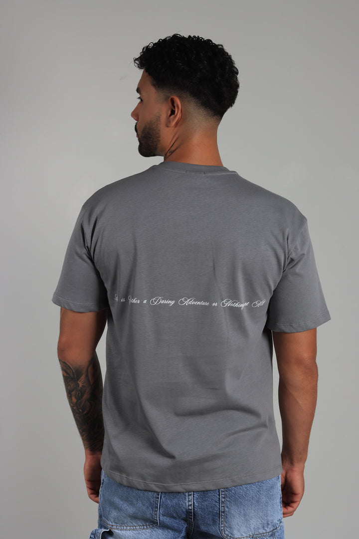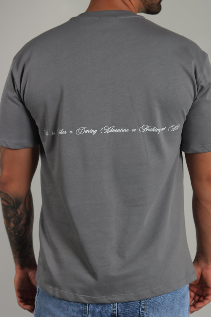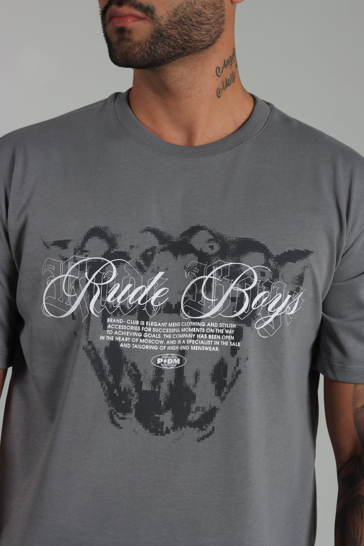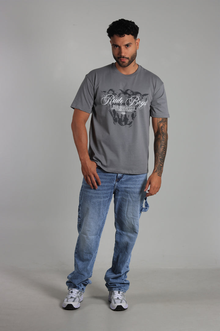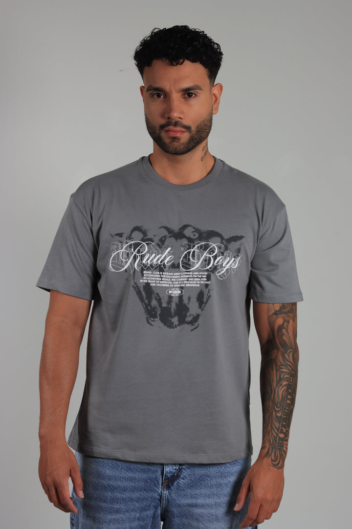 Camiseta de silueta regular. Confeccionada en tela de alto gramaje que aporta estructura y durabilidad. Estampados gráficos al frente y en la espalda. Básica con carácter.