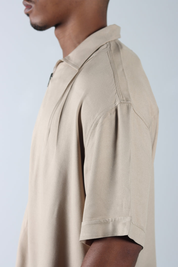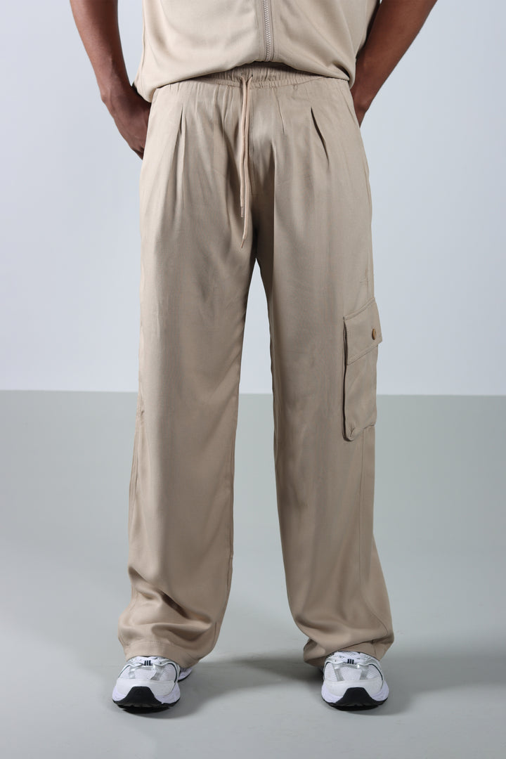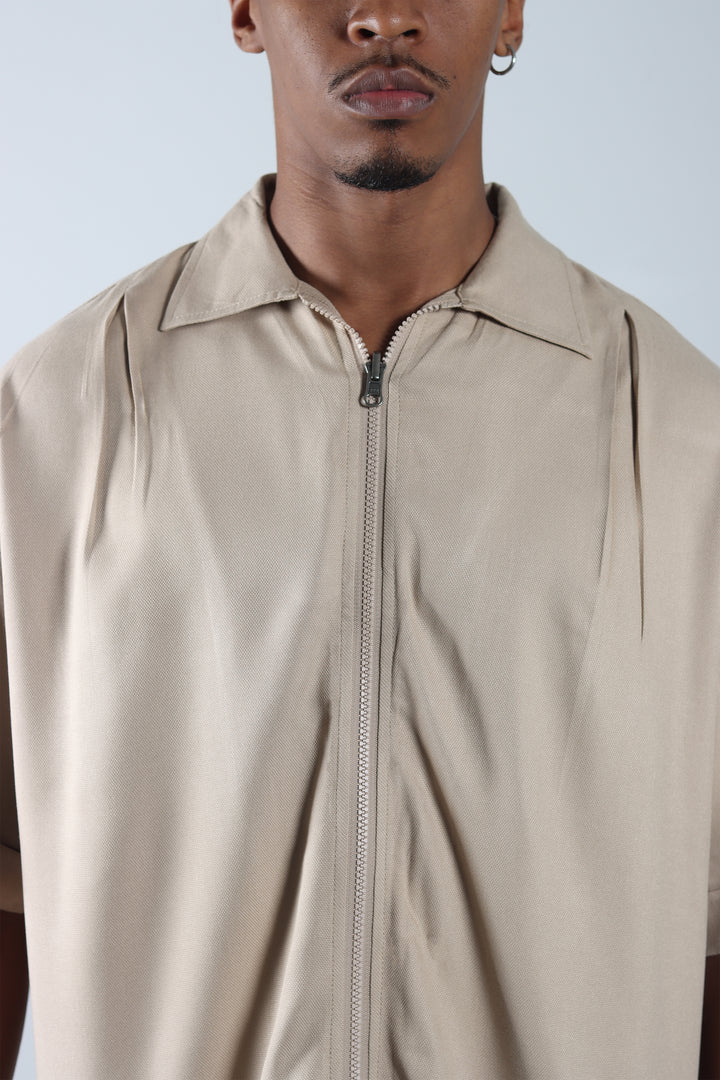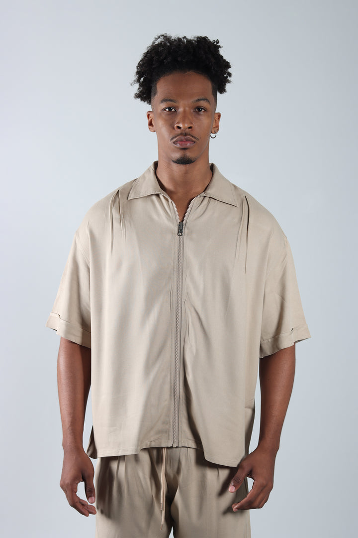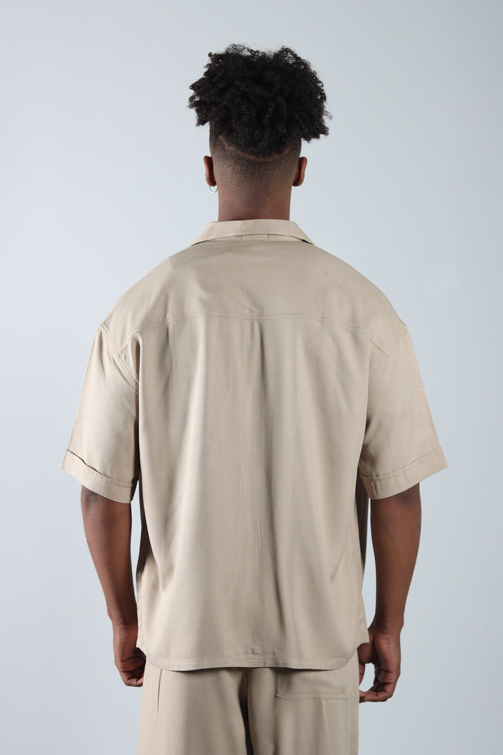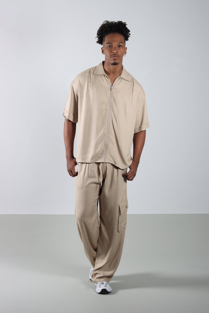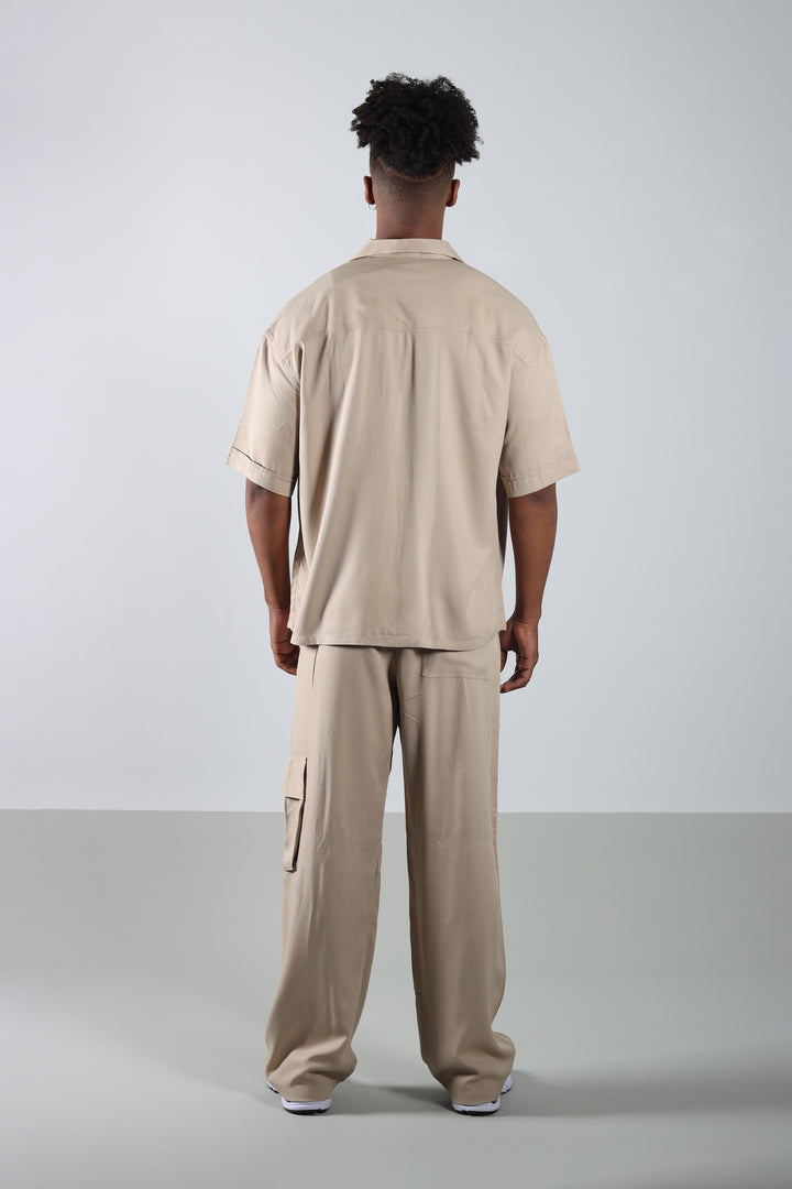Conjunto Beige Boxy Fit Cargo, compuesto por una camisa de cuello sport con cierre frontal y un pantalón cargo con prenses. Silueta amplia, limpia y pensada para un look relajado pero marcado en estructura.