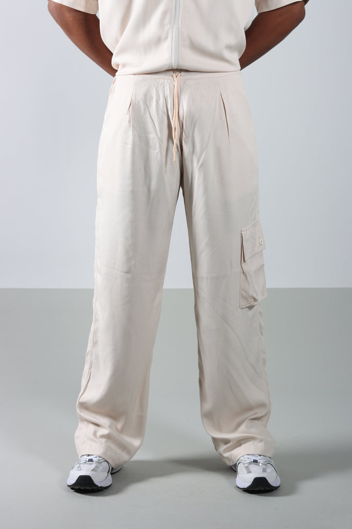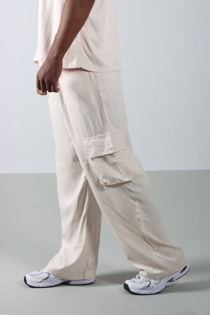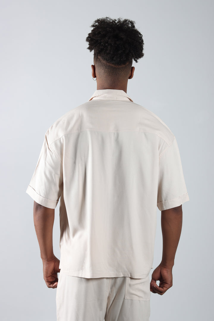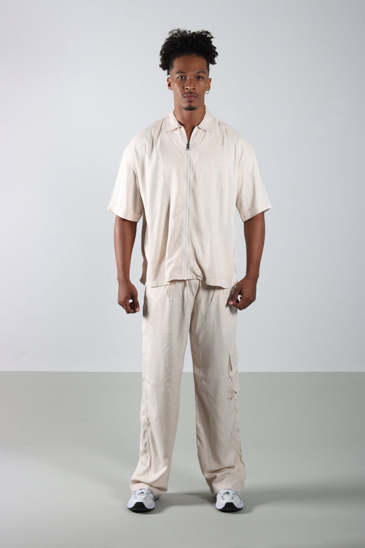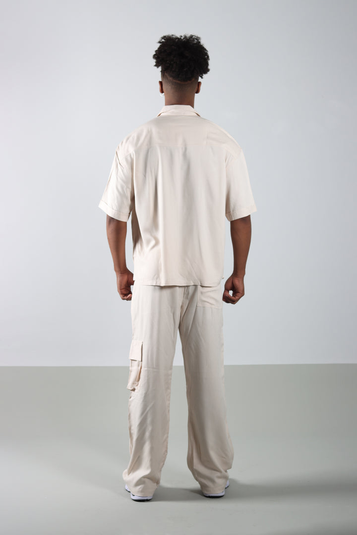 Conjunto Crema Boxy Fit Cargo, compuesto por una camisa de cuello sport con cierre frontal y un pantalón cargo con prenses. Silueta amplia, limpia y pensada para un look relajado pero marcado en estructura.