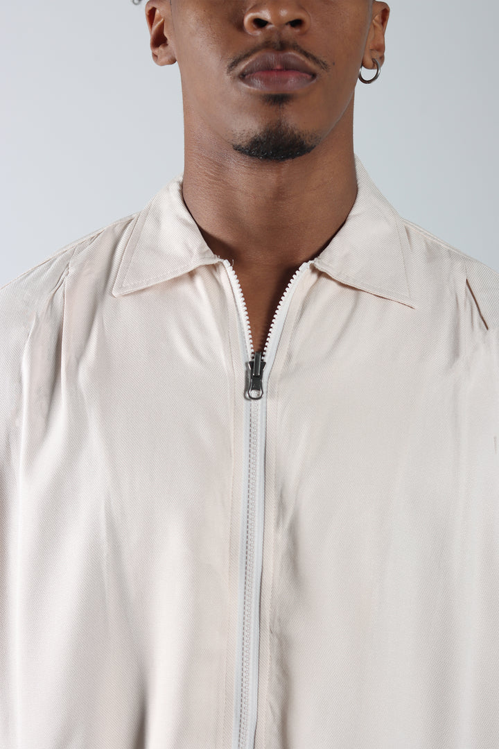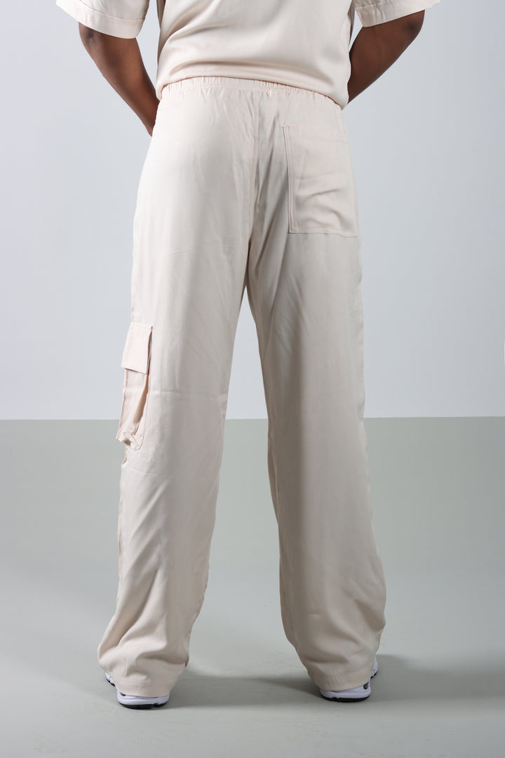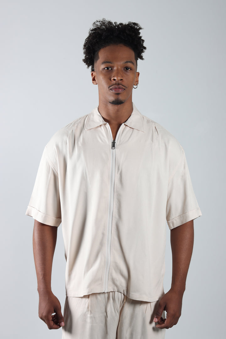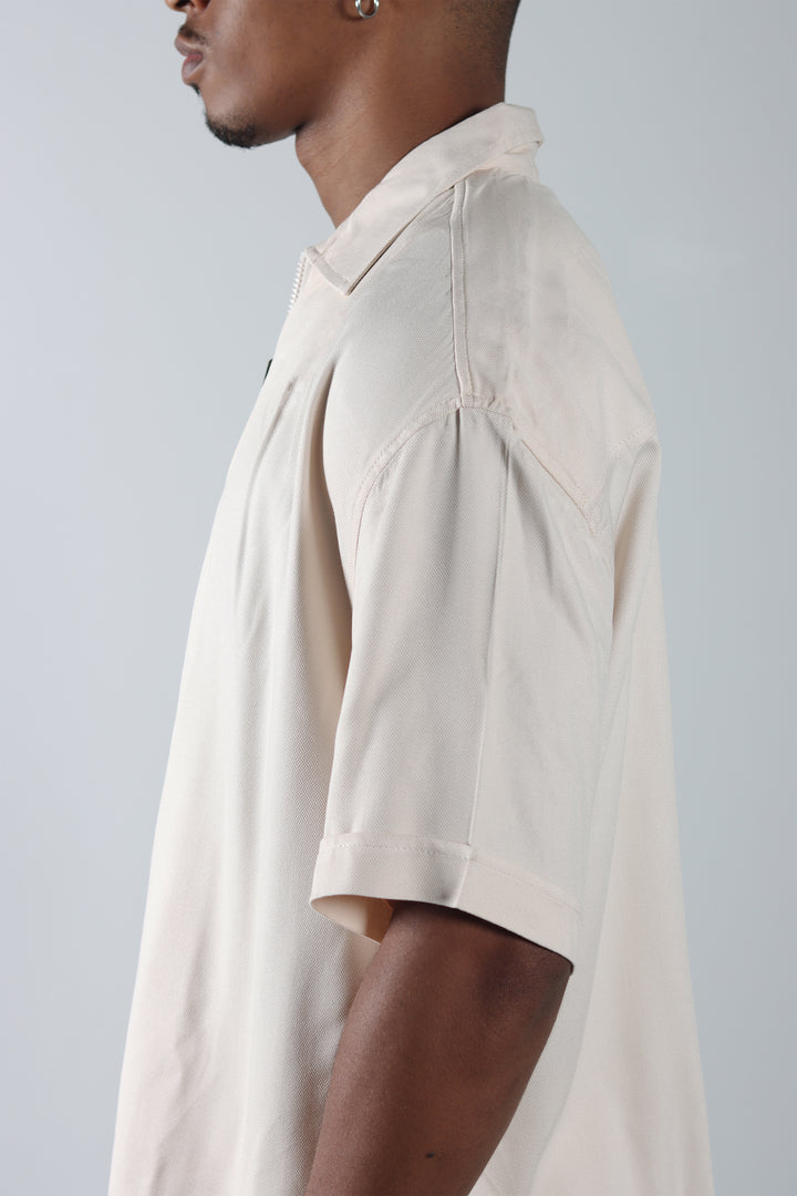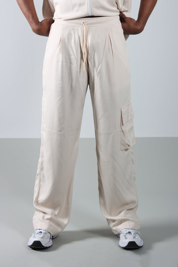 Conjunto Crema Boxy Fit Cargo, compuesto por una camisa de cuello sport con cierre frontal y un pantalón cargo con prenses. Silueta amplia, limpia y pensada para un look relajado pero marcado en estructura.
