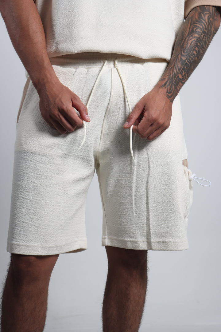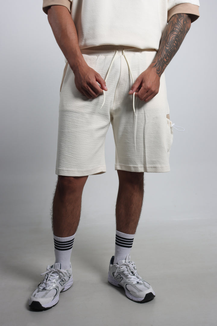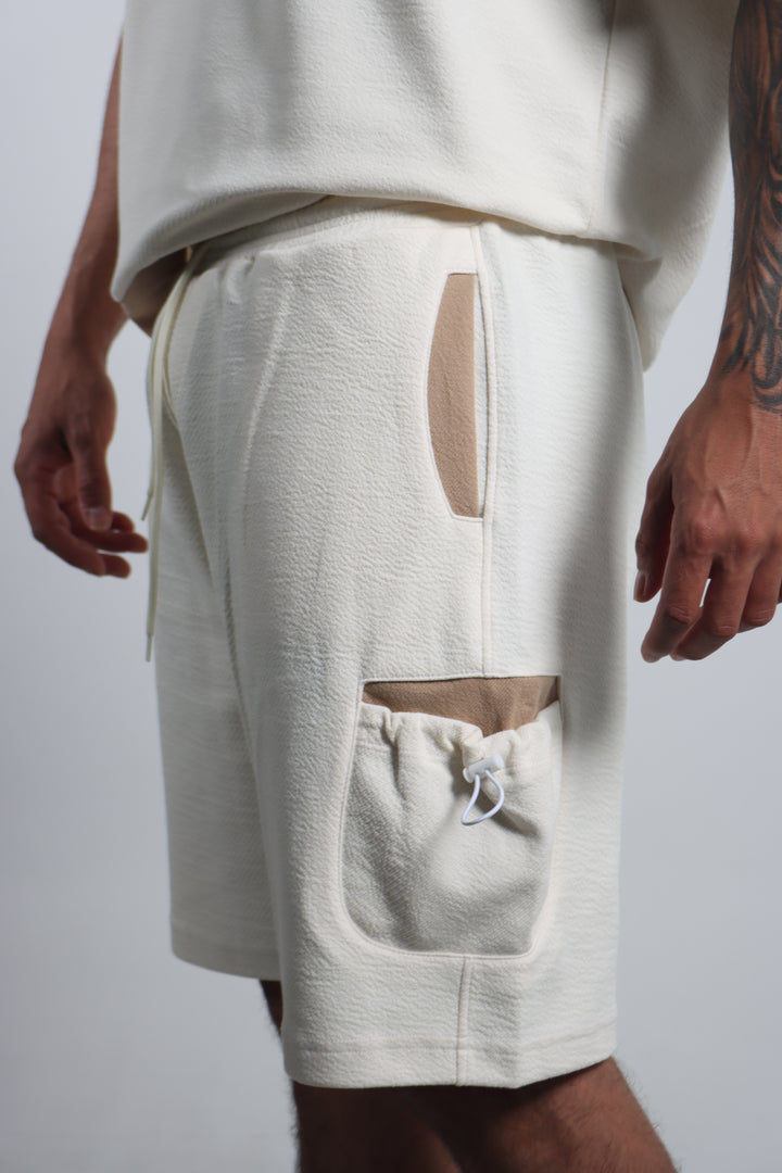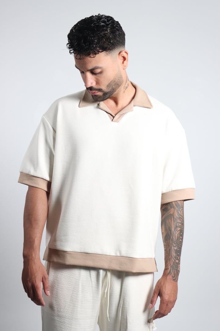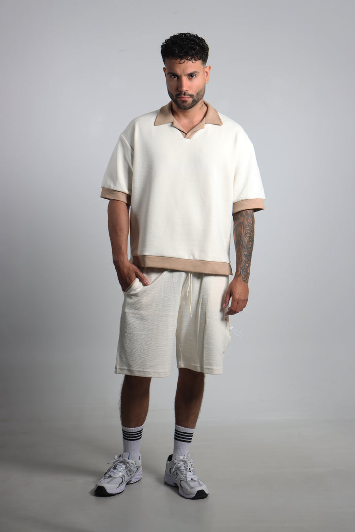 Conjunto compuesto por polo y bermuda en tono marfil, con detalles en cuello, mangas y rib en color beige. El polo presenta un bordado en relieve marfil en la espalda, mientras que la bermuda incorpora bolsillo de estilo cargo.