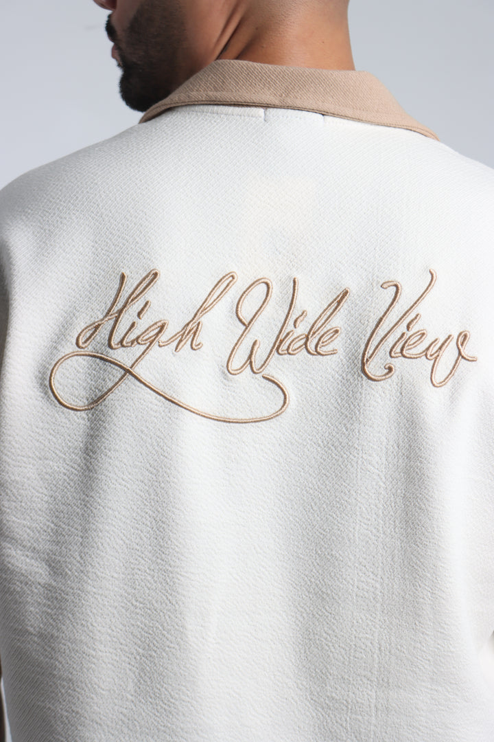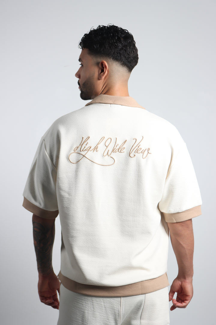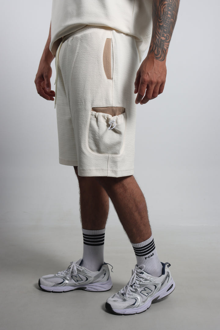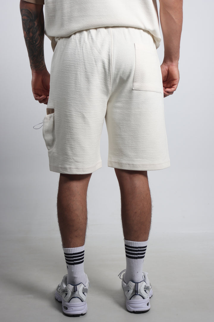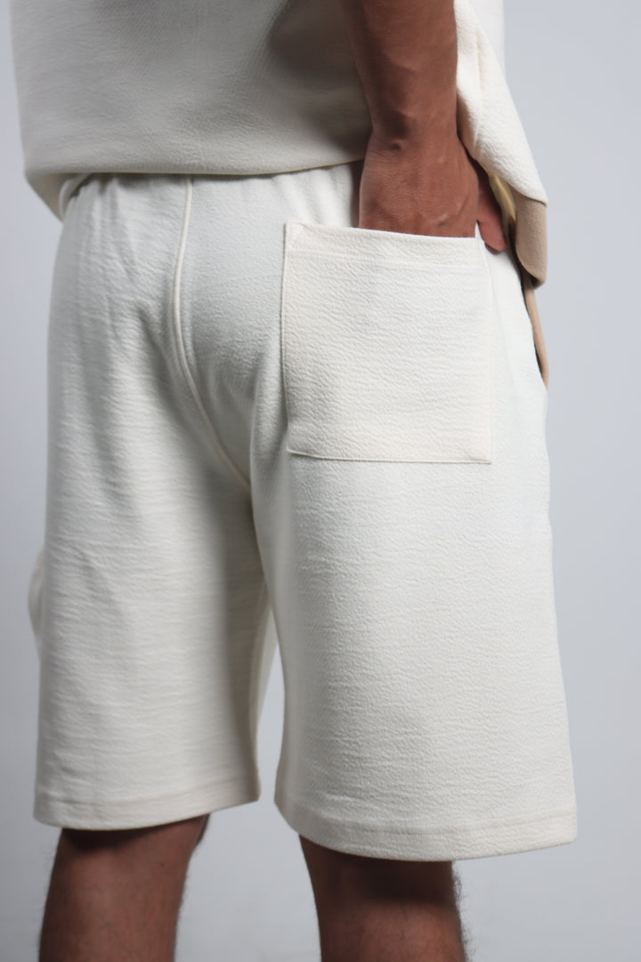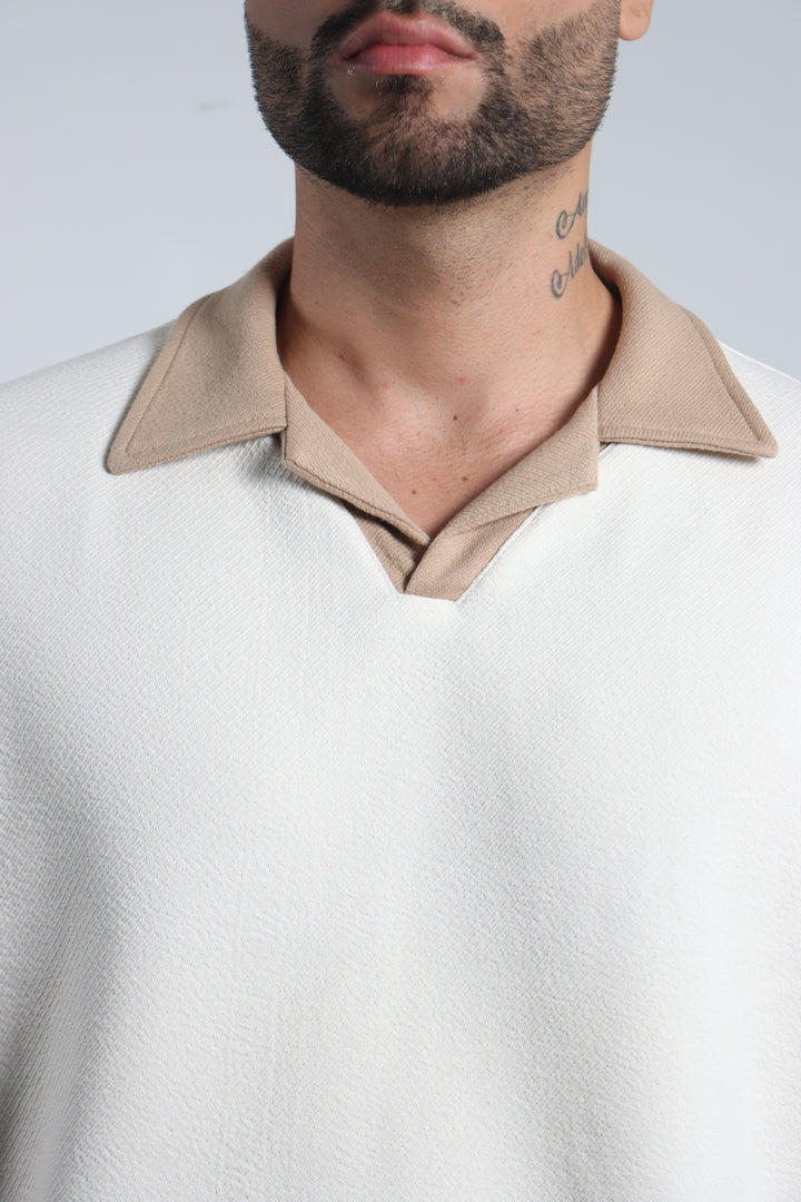 Conjunto compuesto por polo y bermuda en tono marfil, con detalles en cuello, mangas y rib en color beige. El polo presenta un bordado en relieve marfil en la espalda, mientras que la bermuda incorpora bolsillo de estilo cargo.