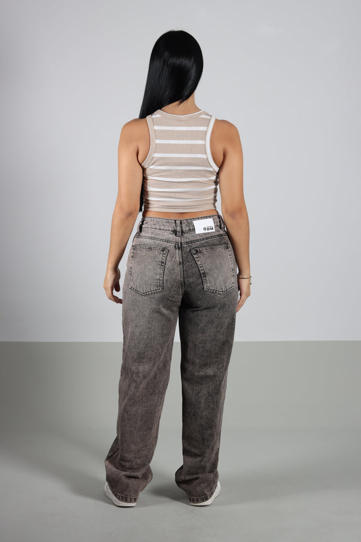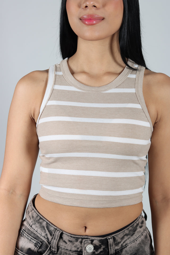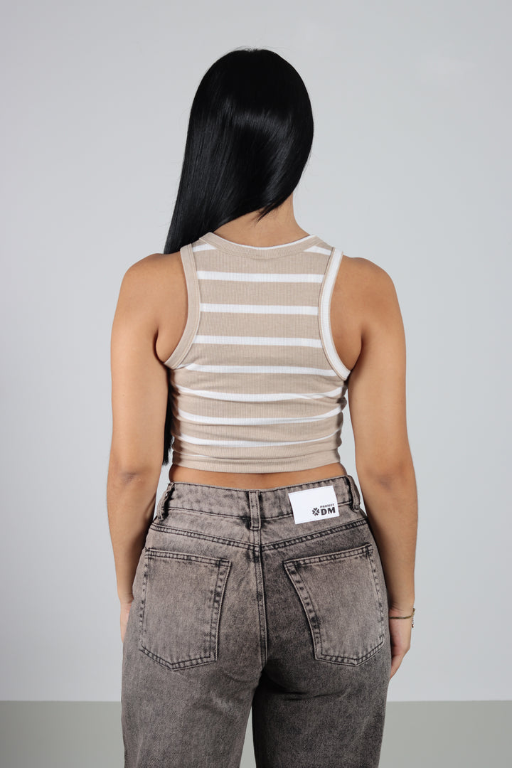 Crop top de silueta slim con cuello y sisas en rib. Diseño de líneas horizontales en crudo y arena. Ajustado, suave y con un fit que resalta la figura.
