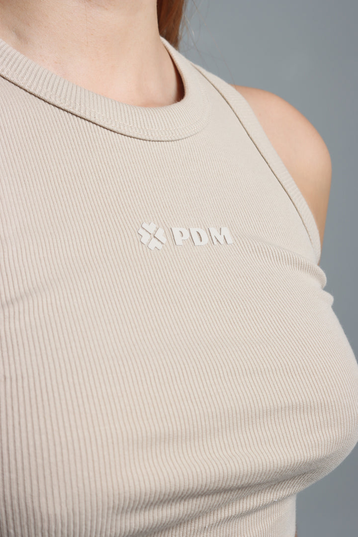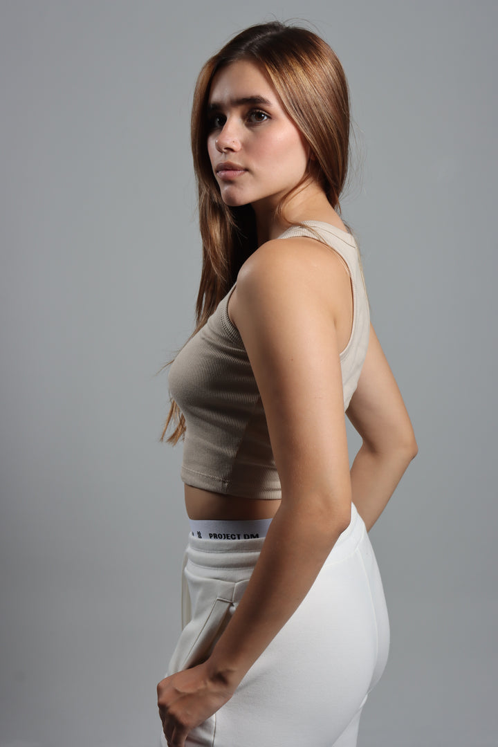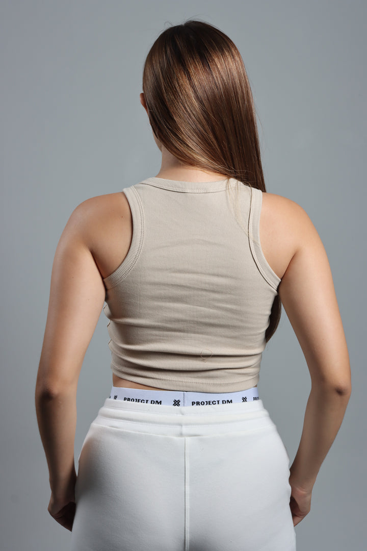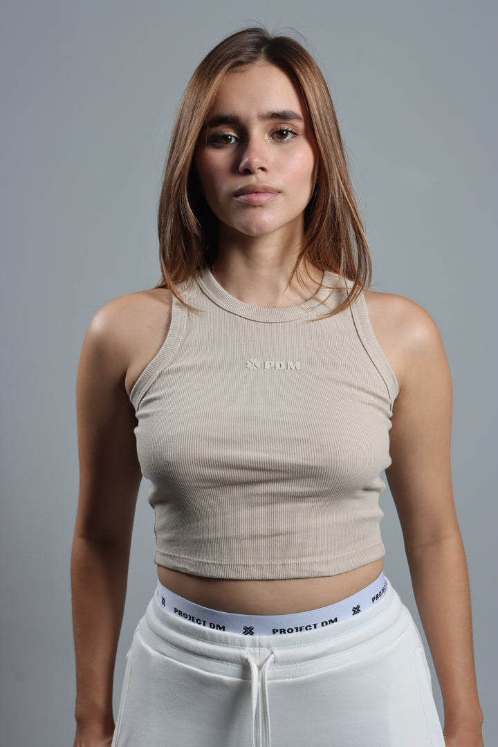 Top corto arena con cuello y sisas en rib. Estampado en semialta al frente. Suave al tacto y con buena estructura. Perfecto para usar solo o debajo de una chaqueta.