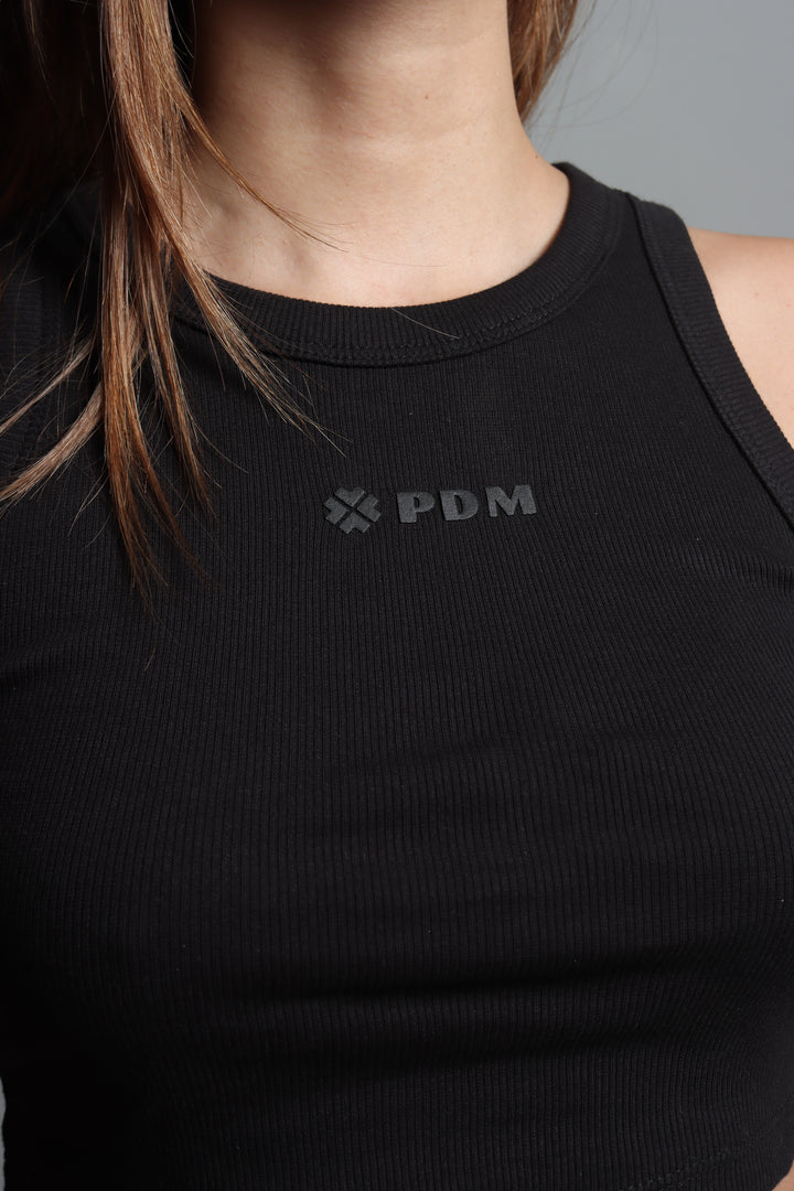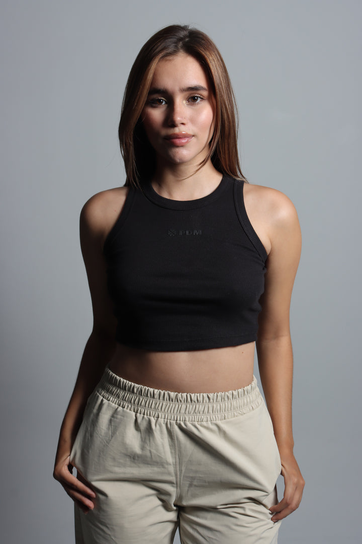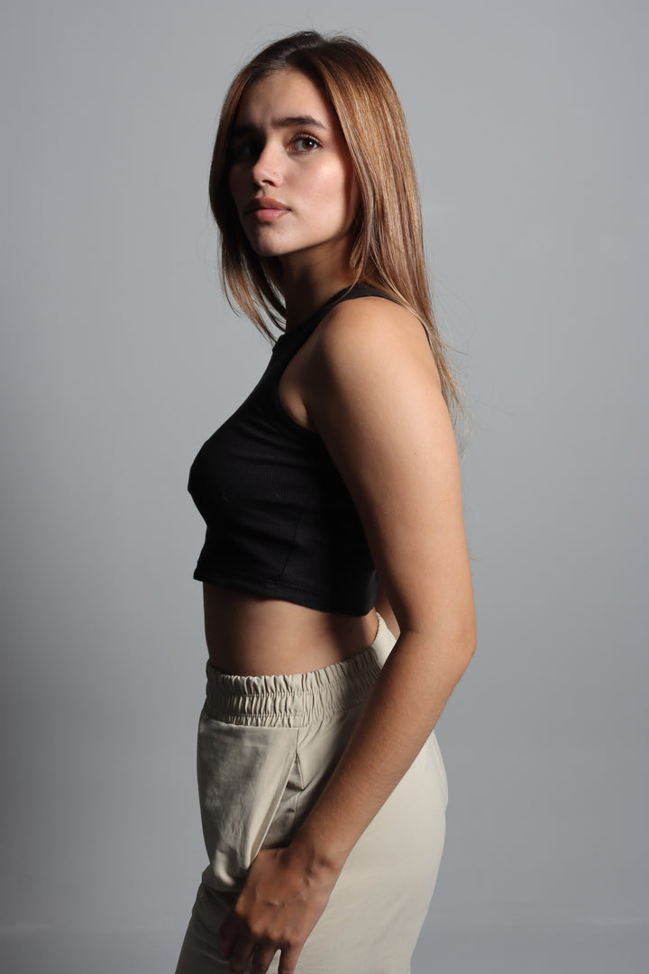 Top corto negro con cuello y sisas en rib. Estampado en semialta al frente. Suave al tacto y con buena estructura. Perfecto para usar solo o debajo de una chaqueta.