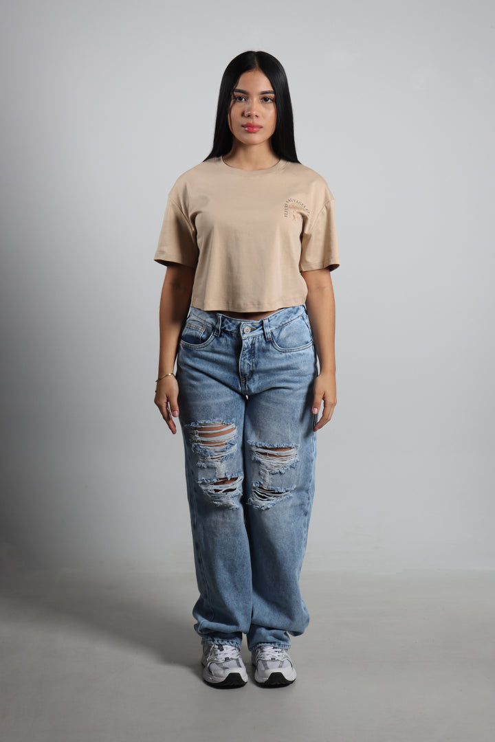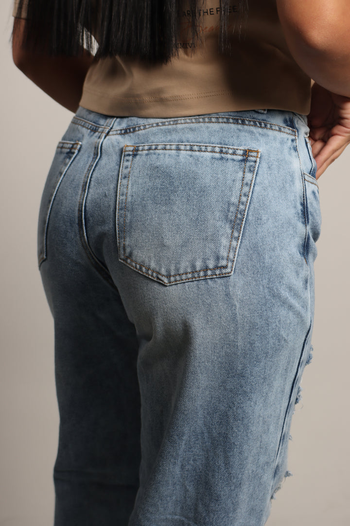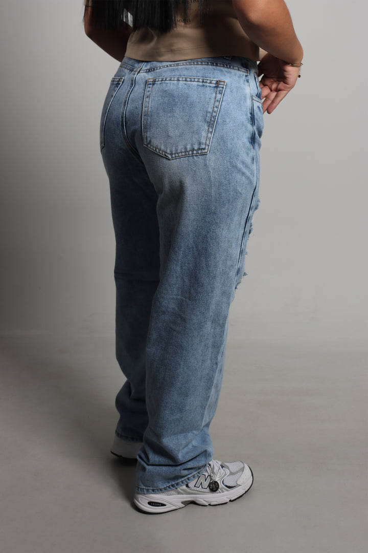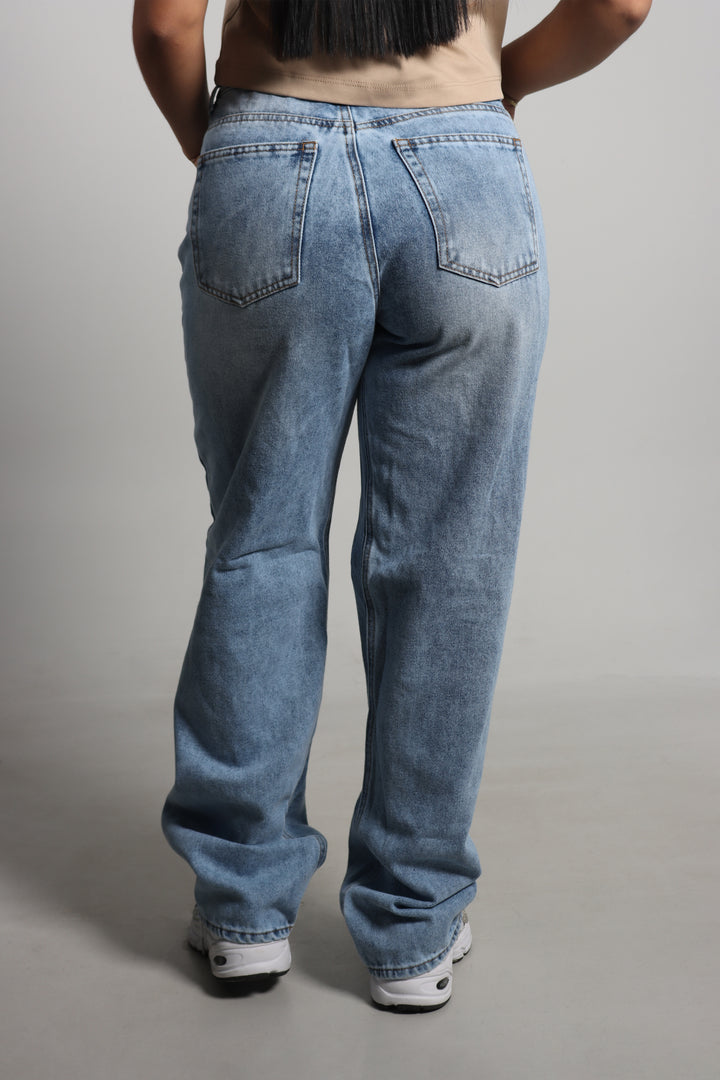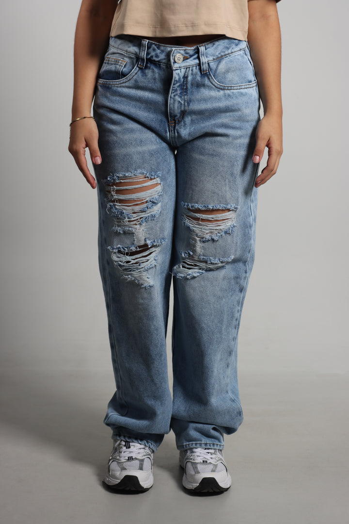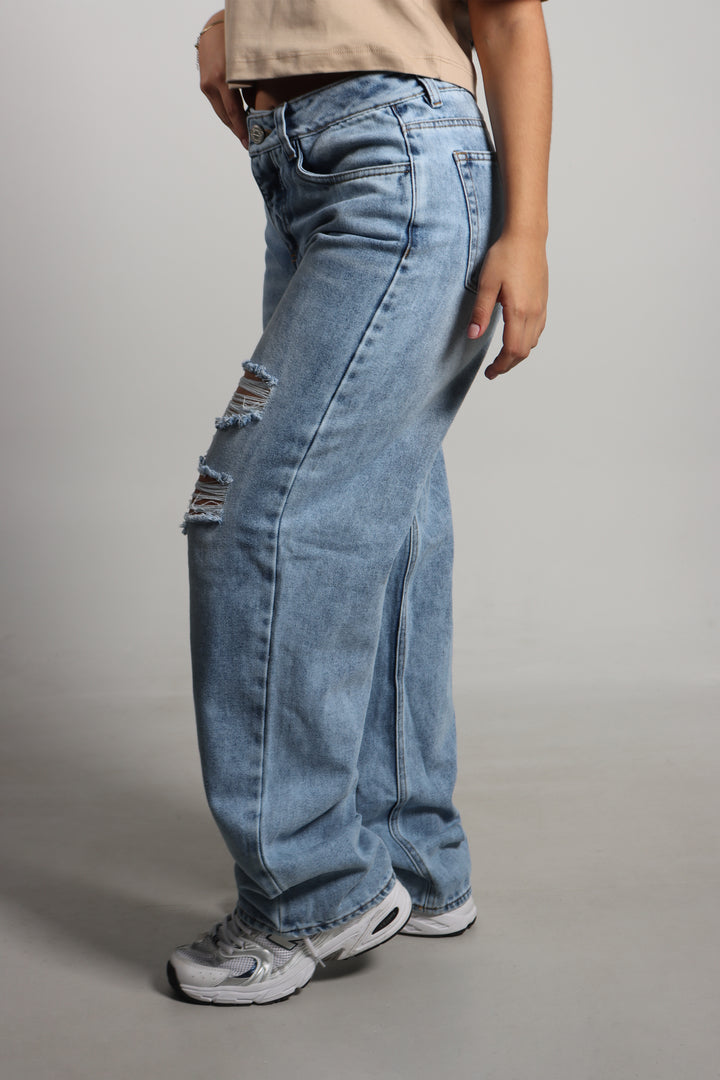 Pantalón en denim azul medio, silueta baggy, con efecto de bigotes y rotos en el frente que le aportan un acabado desgastado y casual.