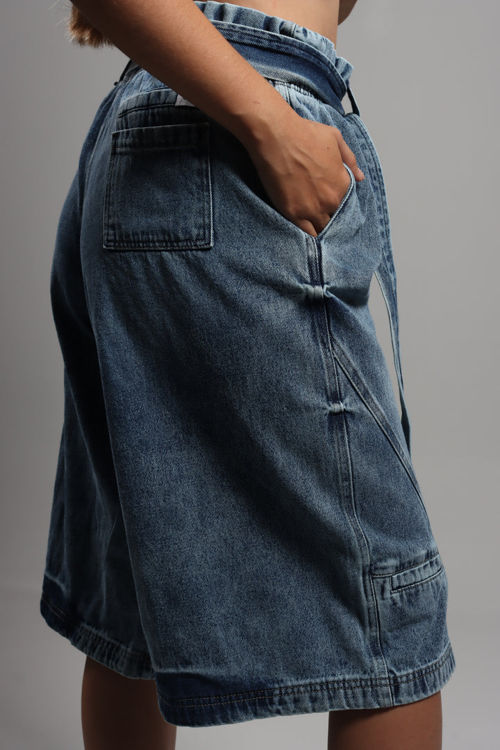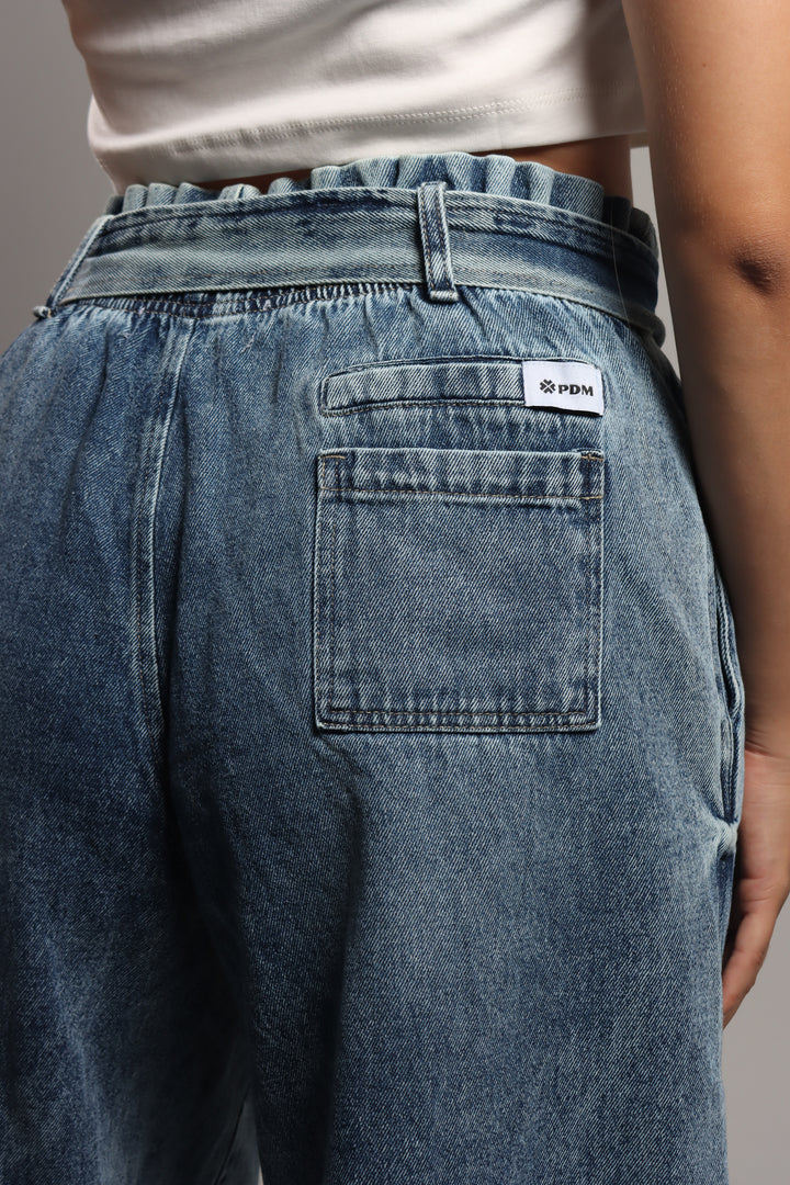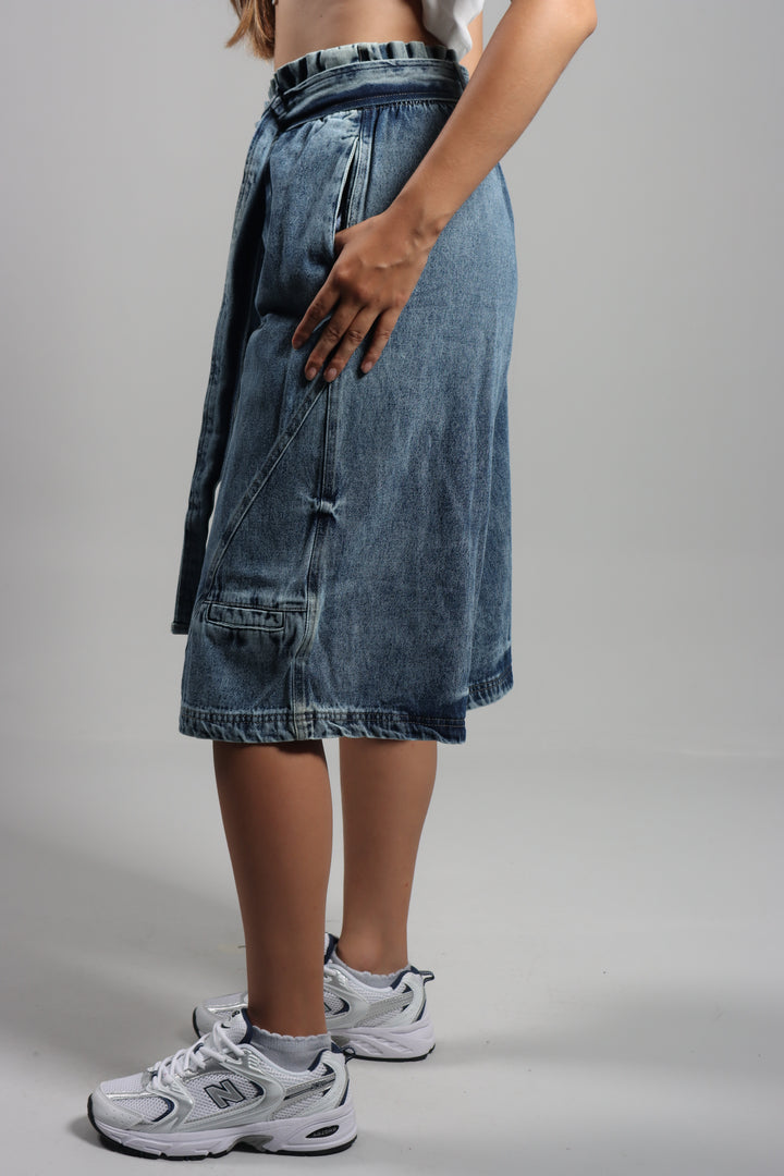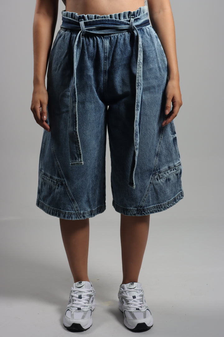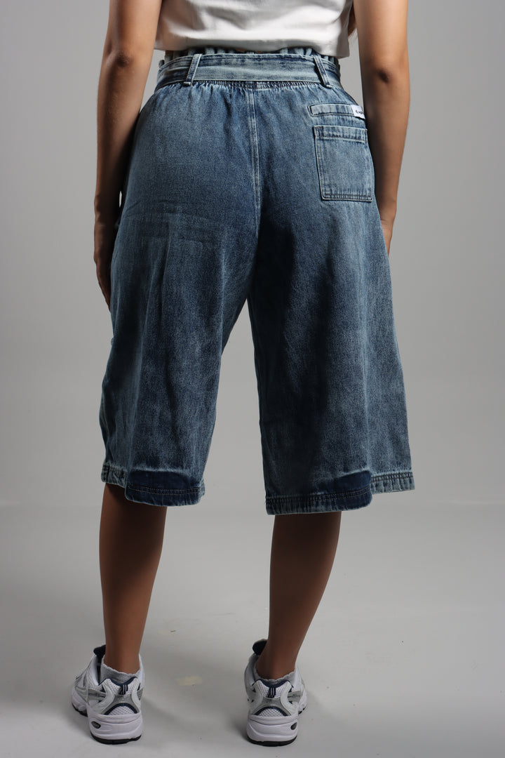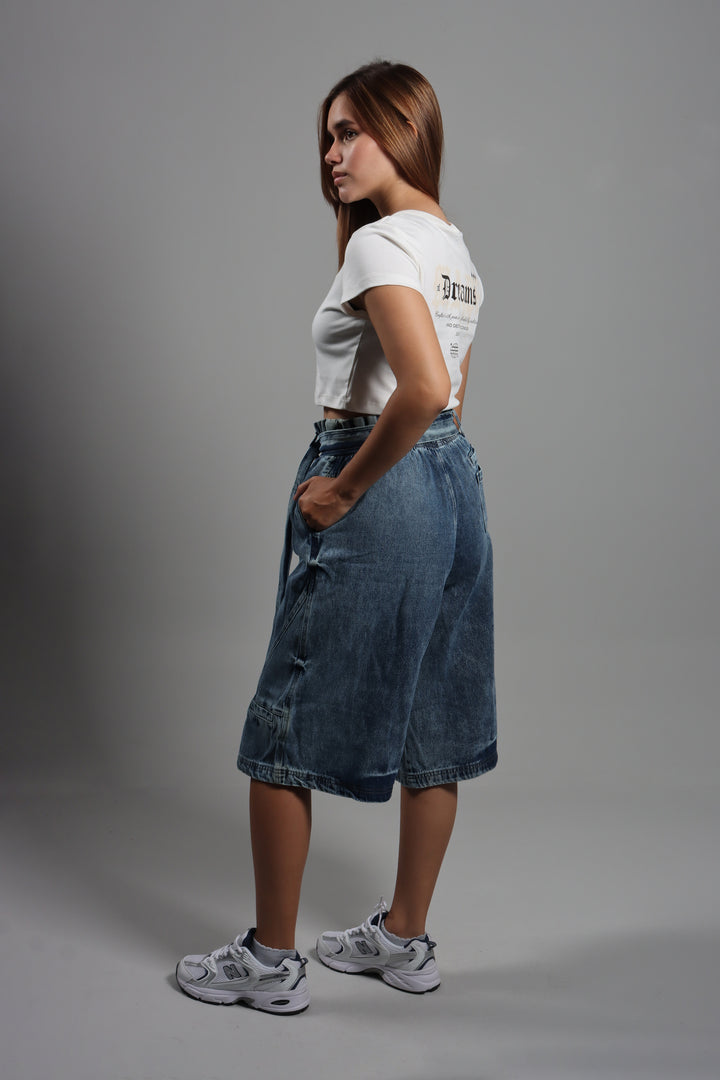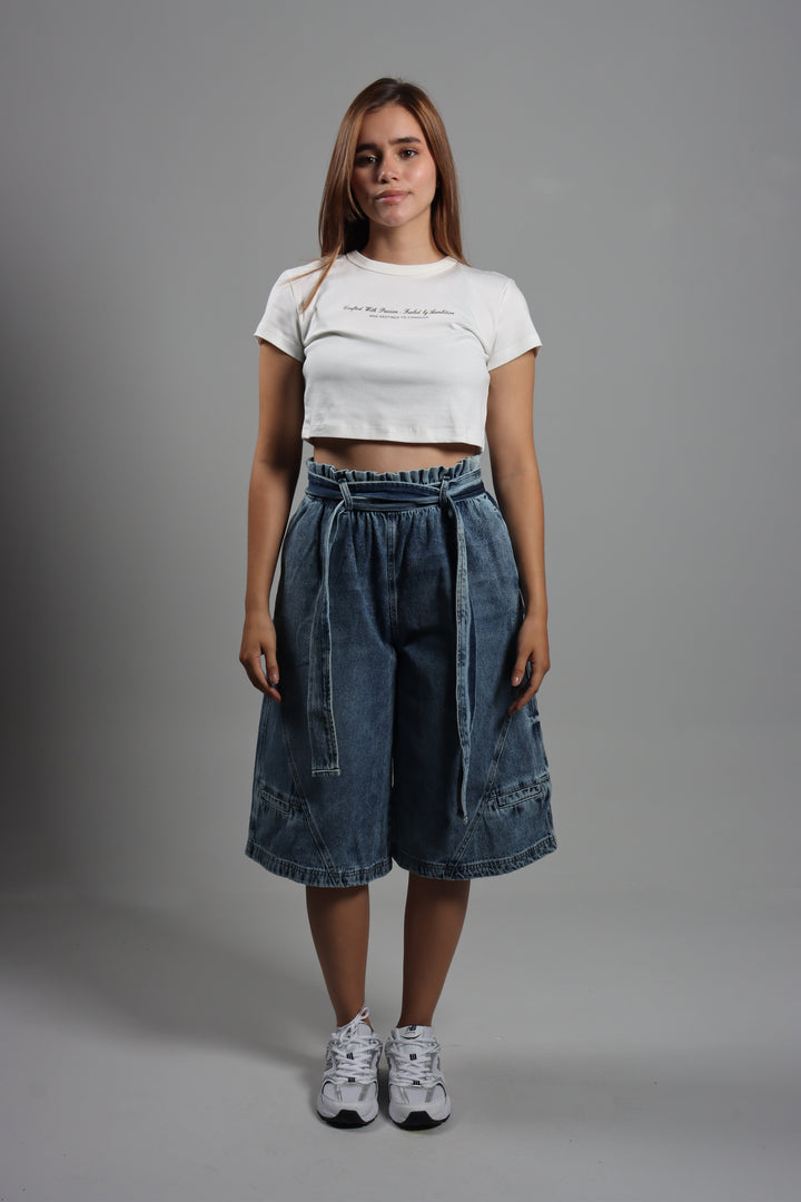 Pantalón de silueta culotte en azul medio. Tiro alto, bota amplia y estructura fluida. Fresco, versátil y con caída ligera para el día a día.