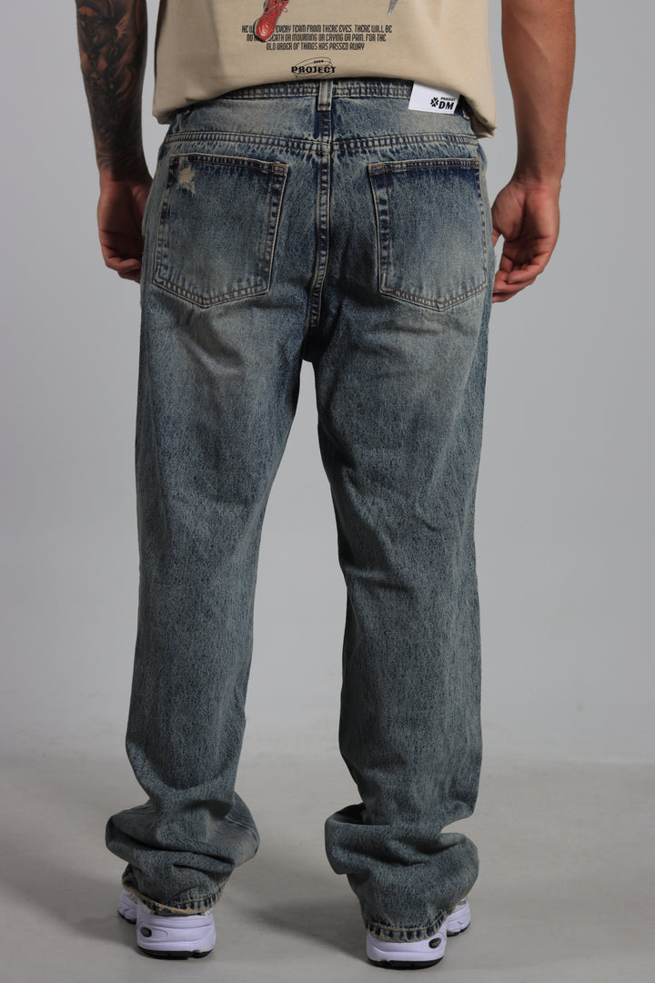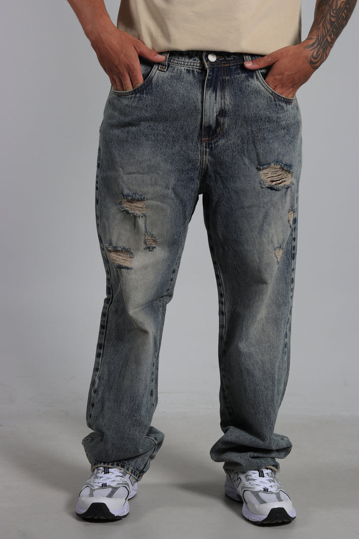 Pantalón de silueta baggy en tono azul sky medio. Detalles de rotos al frente que le dan un look desgastado y urbano. Suelto, cómodo y con actitud relajada.