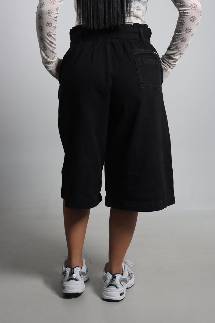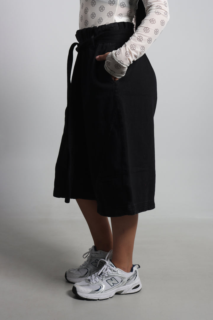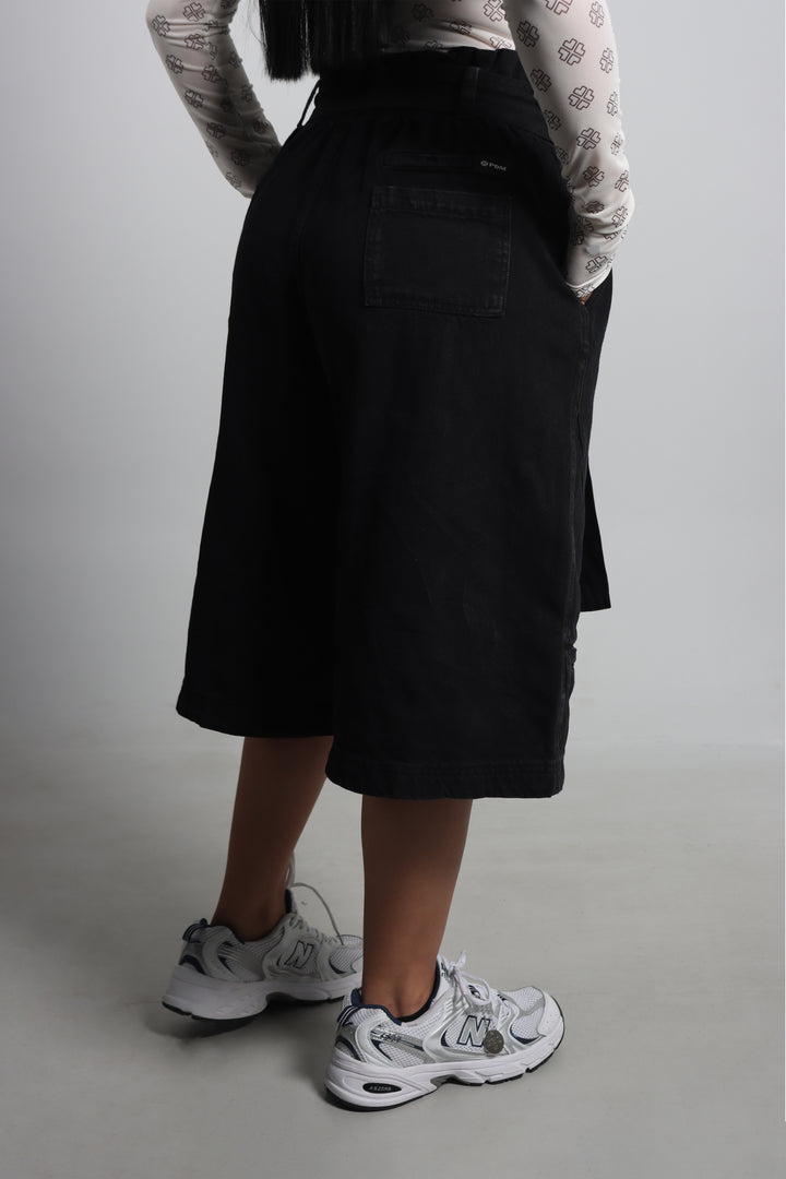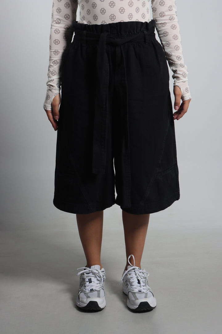 Pantalón en color negro, silueta culotte de corte amplio y fluido. Incluye cinturón en la pretina que aporta ajuste y un detalle extra al diseño minimalista de la prenda.
