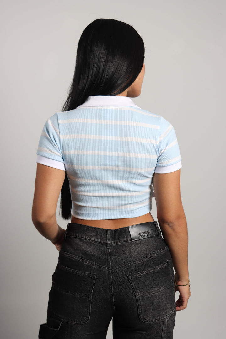 Polo de silueta cropped con cuello sport, diseño de líneas horizontales en azul y blanco, e isotipo de la marca bordado en el lateral del pecho.