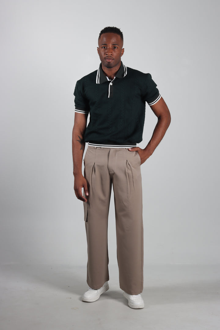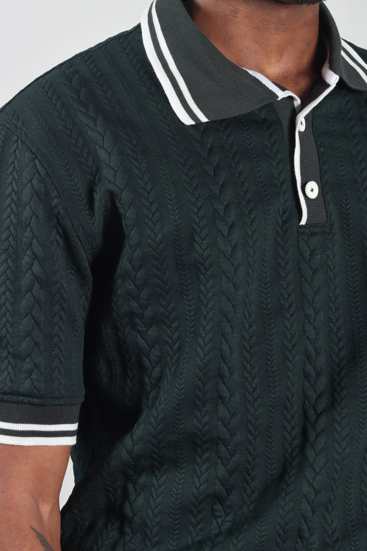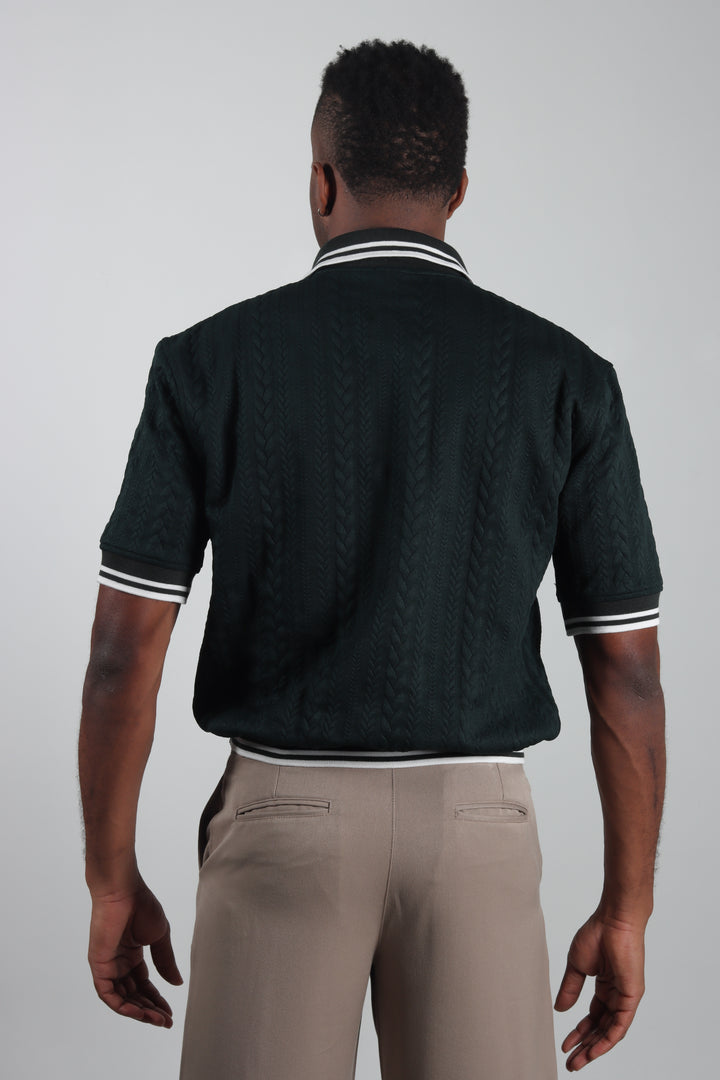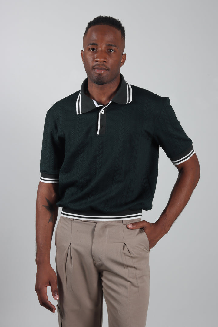 Polo de silueta regular en tono verde botella, con rib en cartera, mangas y cuello. Acabado en textura que aporta carácter y detalle a la prenda.